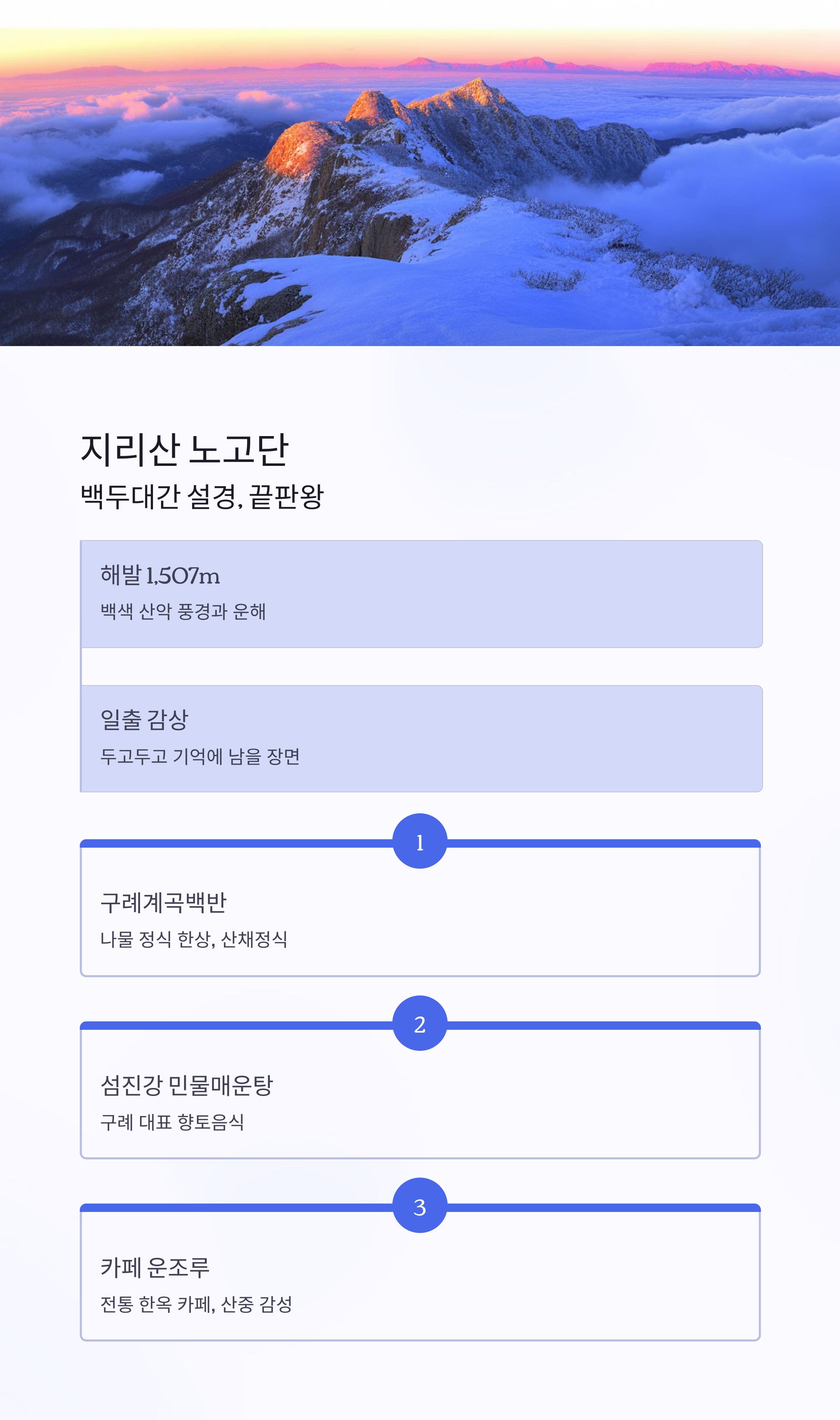 즐길거리: 눈산 트레킹, 일출 감상, 구례 온천 연계