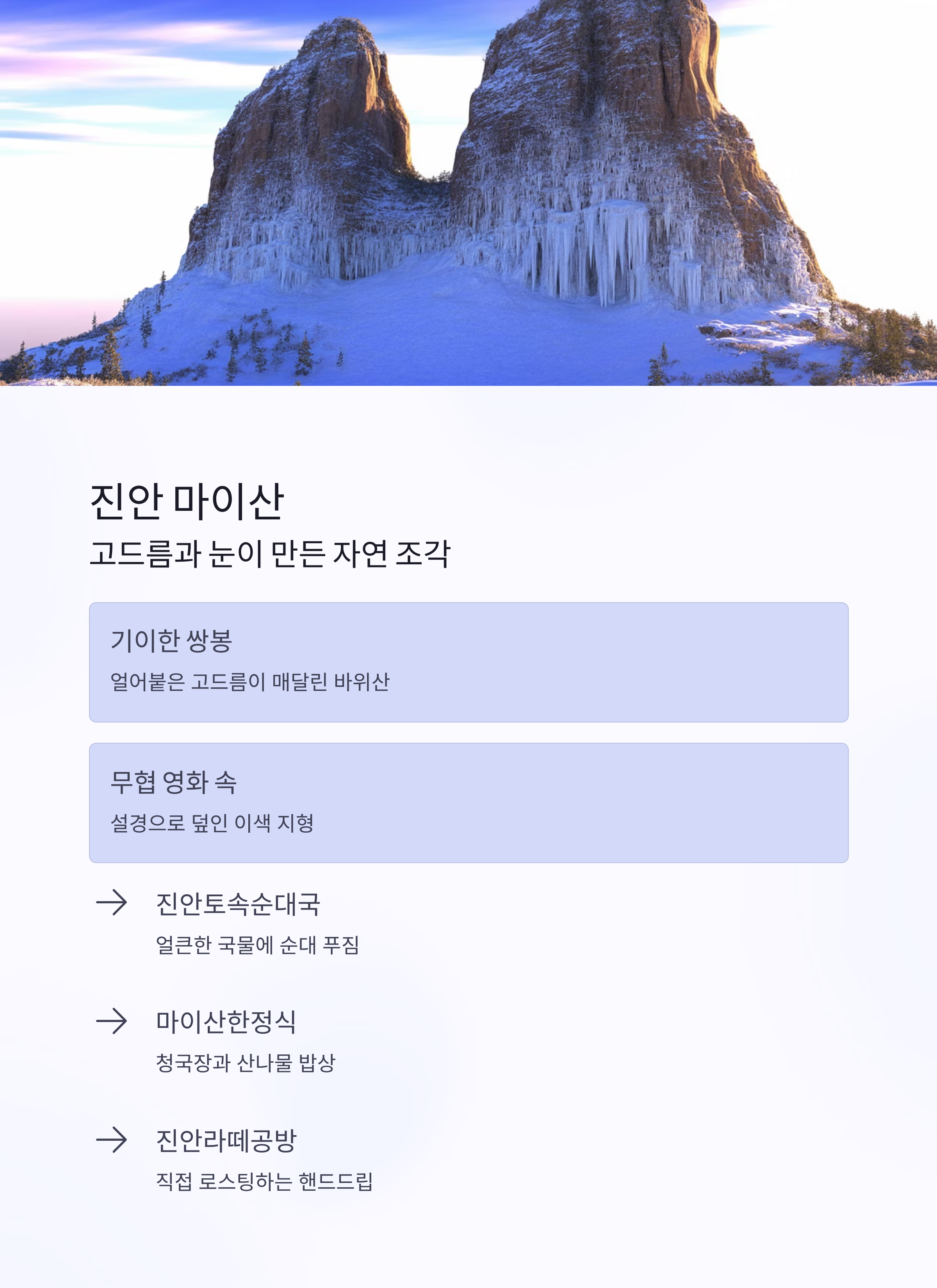 특징: 이색 지형과 고드름, 조용한 눈 풍경