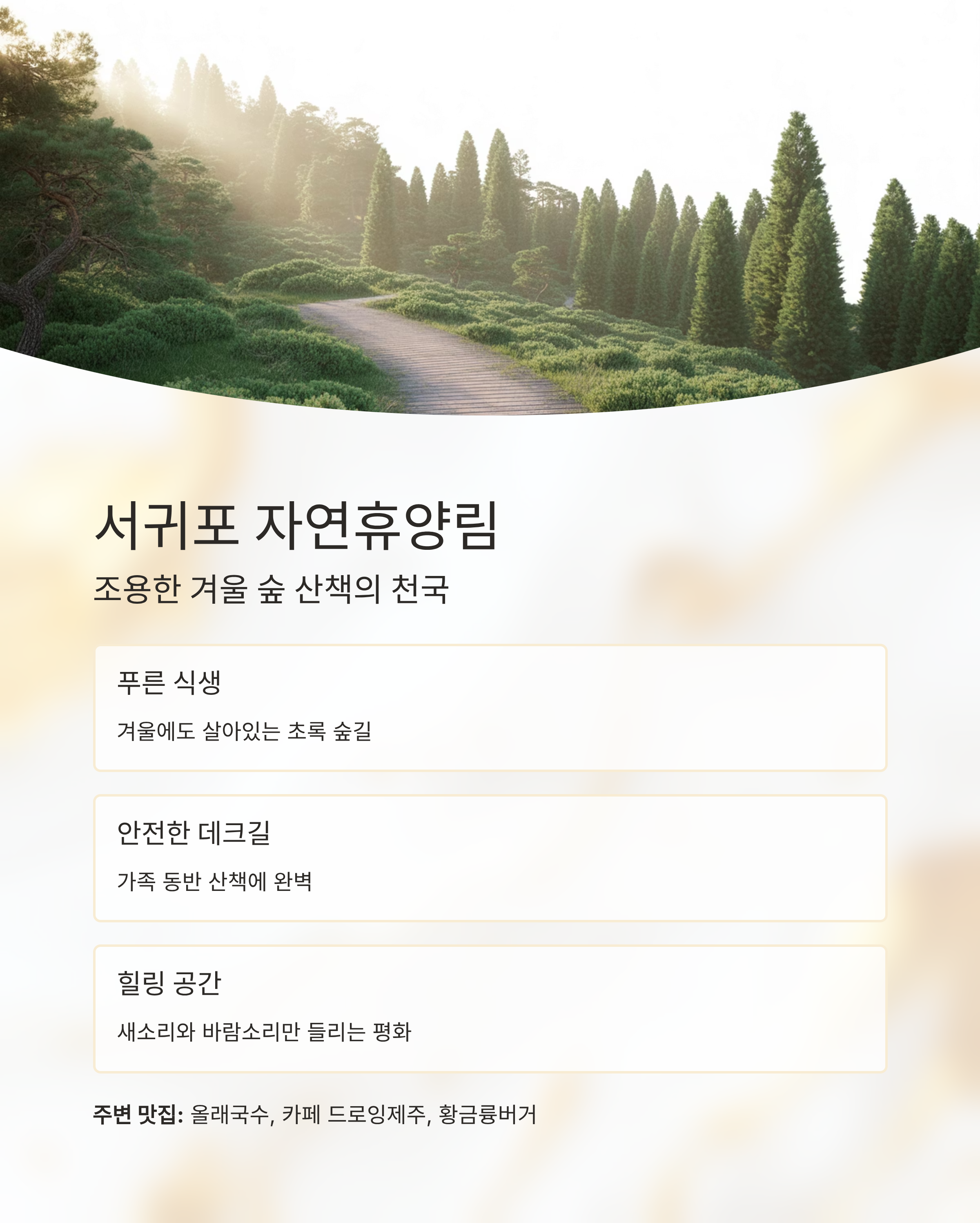 서귀포 자연휴양림은 조용한 겨울 숲 산책을 즐기기에 최적의 장소입니다.