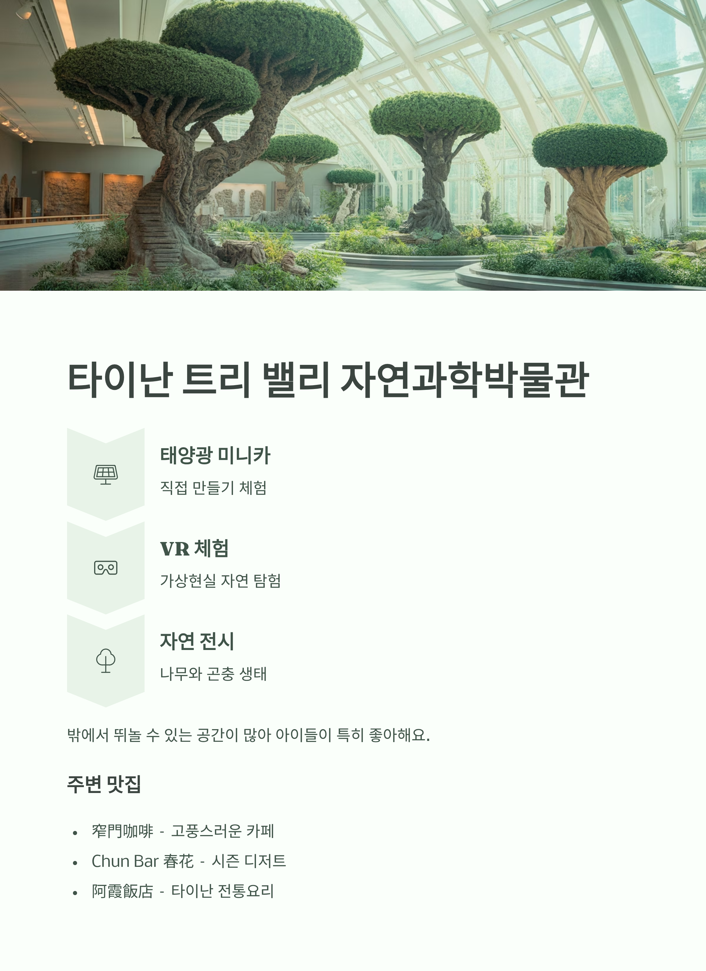 - 특징: 나무, 곤충, 친환경 에너지 체험 전시