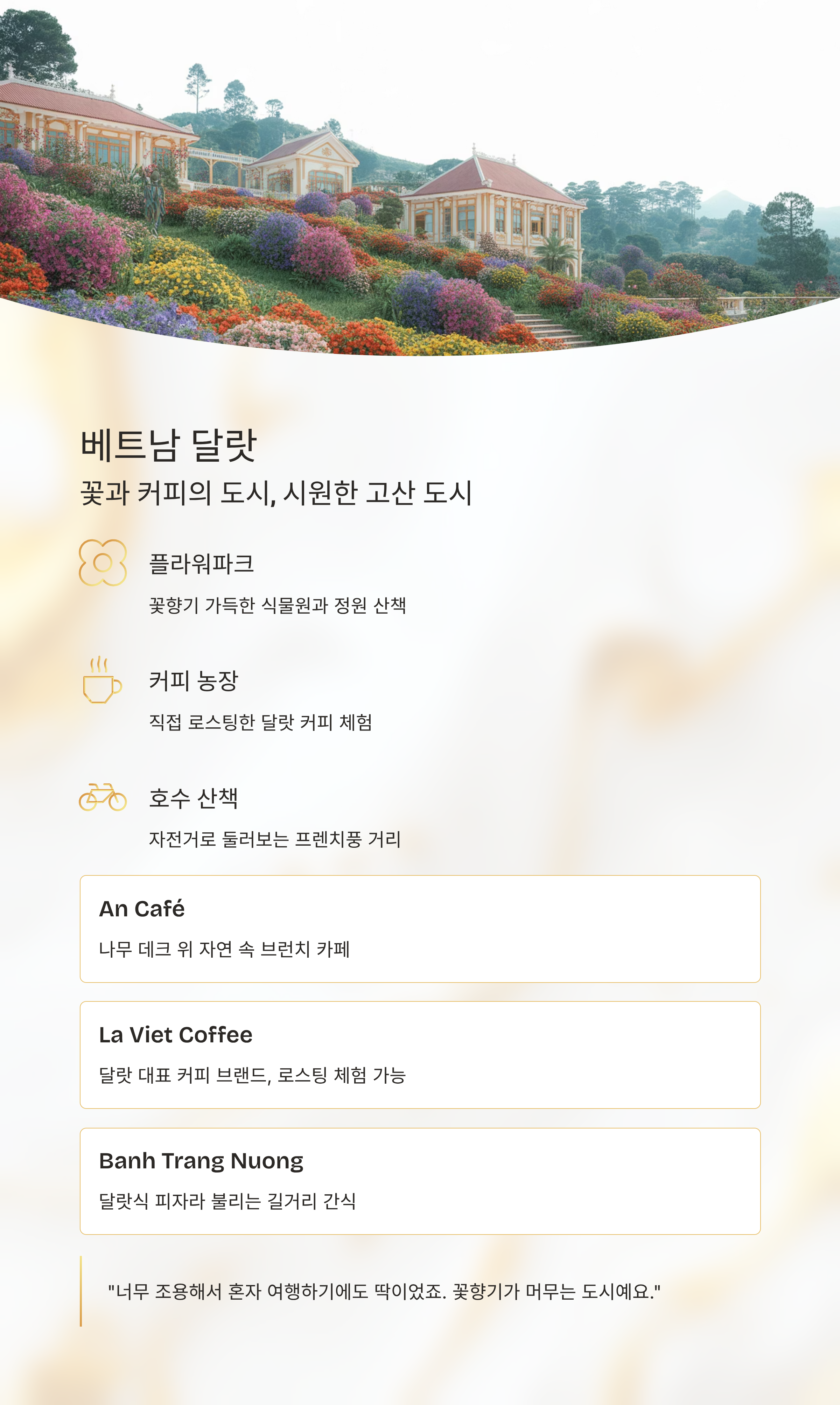 - 체험 후기: “사람도 친절하고, 커피도 너무 맛있어요. 너무 조용해서 혼자 여행하기에도 딱이었죠. 꽃향기가 머무는 도시예요.”