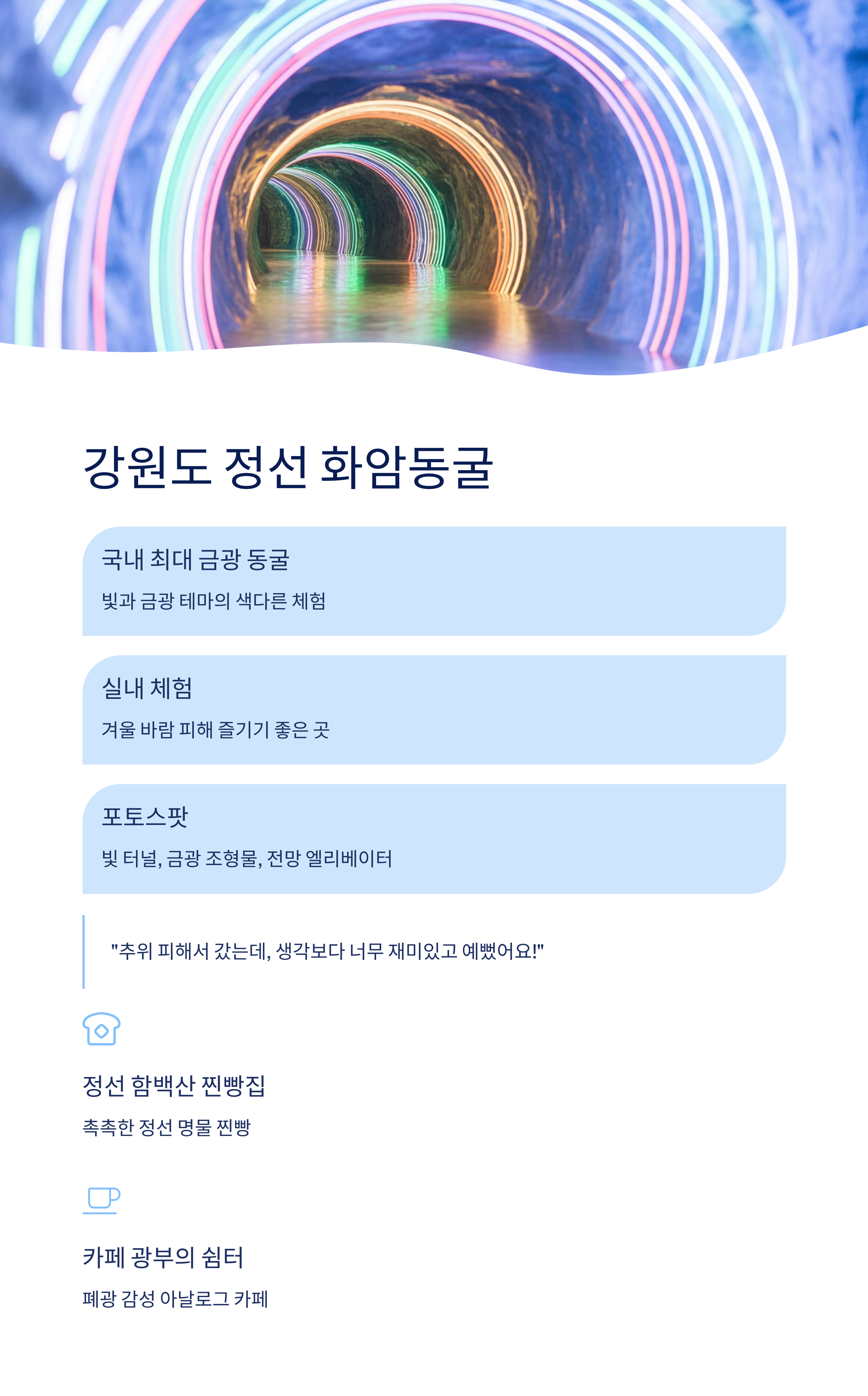 빛과 금광 테마가 결합된 색다른 동굴 체험이 가능합니다.주소: 강원도 정선군 화암면 화암동굴길 12