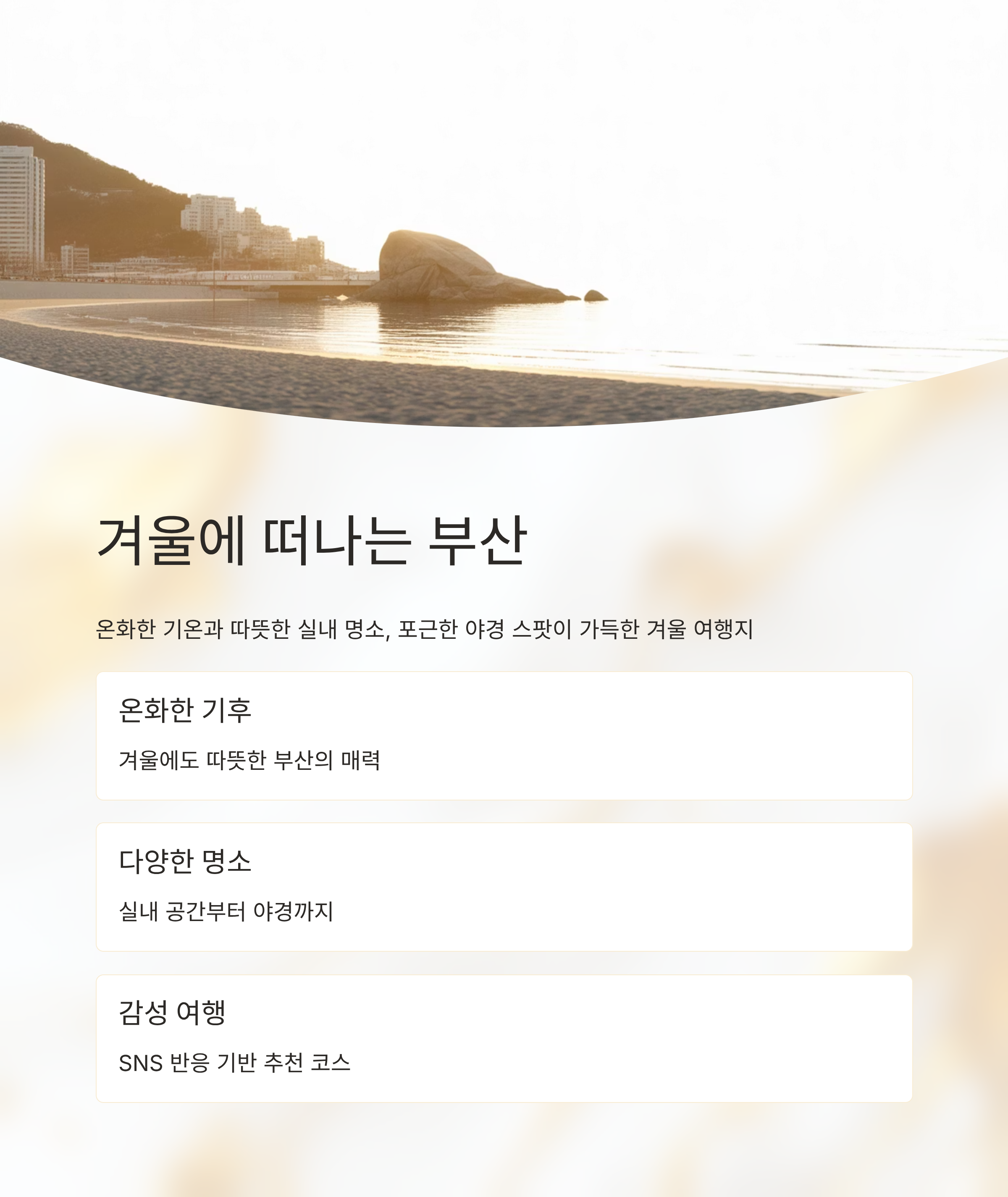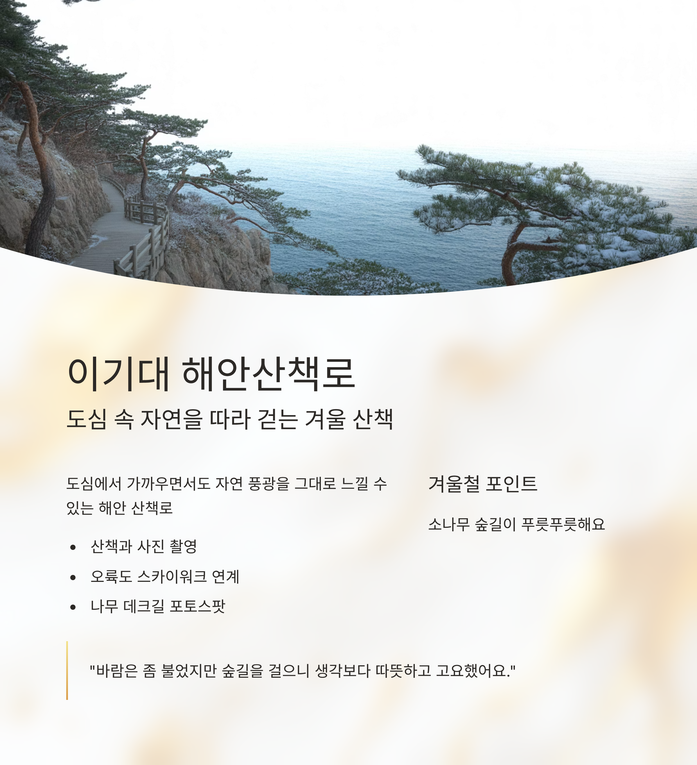 부산은 겨울에도 온화한 기온 덕분에 국내 겨울여행지로 꾸준히 사랑받고 있습니다. 특히 겨울철에도 따뜻하게 머물 수 있는 실내 명소와 포근한 감성이 묻어나는 야경 스팟, 여유로운 산책길 등 다양한 매력이 가득하죠. 이번 글에서는 따뜻하고 예쁜 겨울 여행지를 중심으로, 여행 코스, 체험 후기, 포토스팟은 물론 지역 맛집과 감성 카페도 함께 소개해 드립니다. 모든 정보는 최근 SNS 반응과 실제 방문 후기를 기반으로 하며, 과장 없이 정확하고 신뢰할 수 있는 내용만 담았습니다.