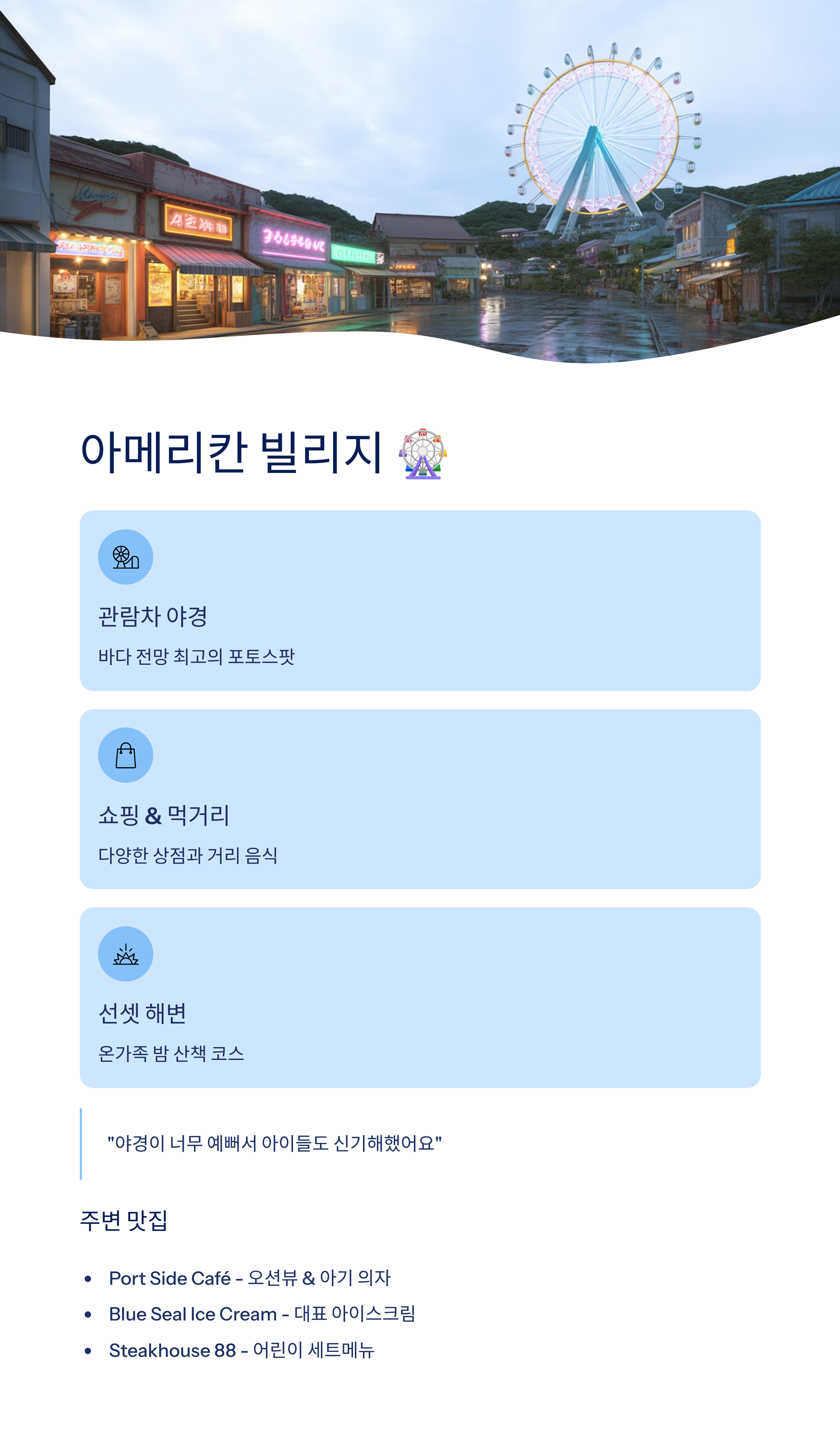 서양풍 거리, 바다 전망, 관람차, 다양한 맛집과 상점이 모인 복합 문화 공간. 낮보다 밤에 더 아름답고, 가족이 머물며 여유롭게 즐기기 좋은 야경 명소입니다.즐길거리
