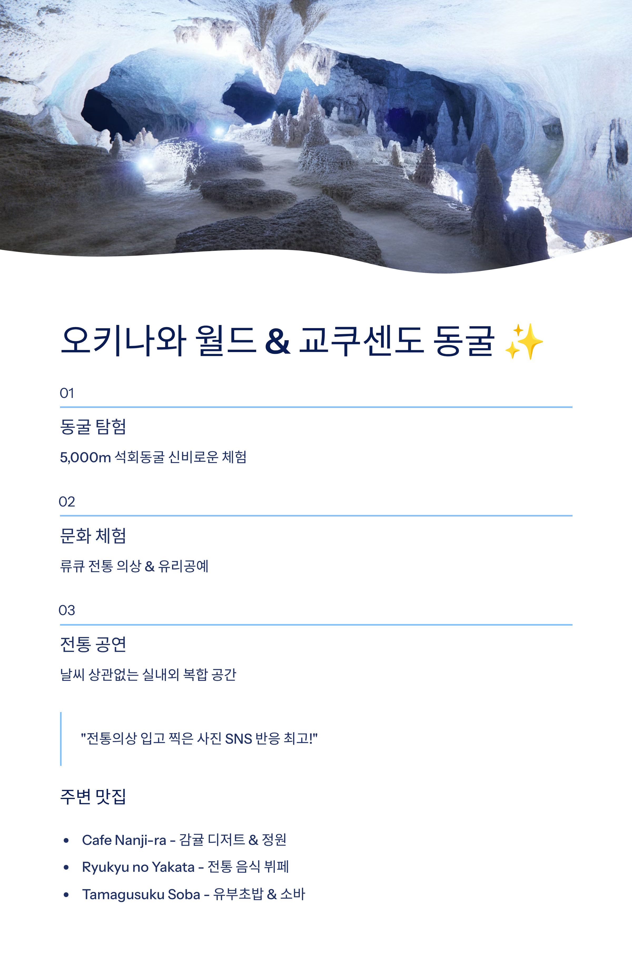5,000m 이상의 석회동굴 ‘교쿠센도’를 중심으로, 유리공방, 류큐 전통 의상 체험, 전통 공연까지 가능한 다채로운 복합 문화공간입니다. 실내외 혼합 구성으로 날씨 상관없이 즐길 수 있어요.즐길거리