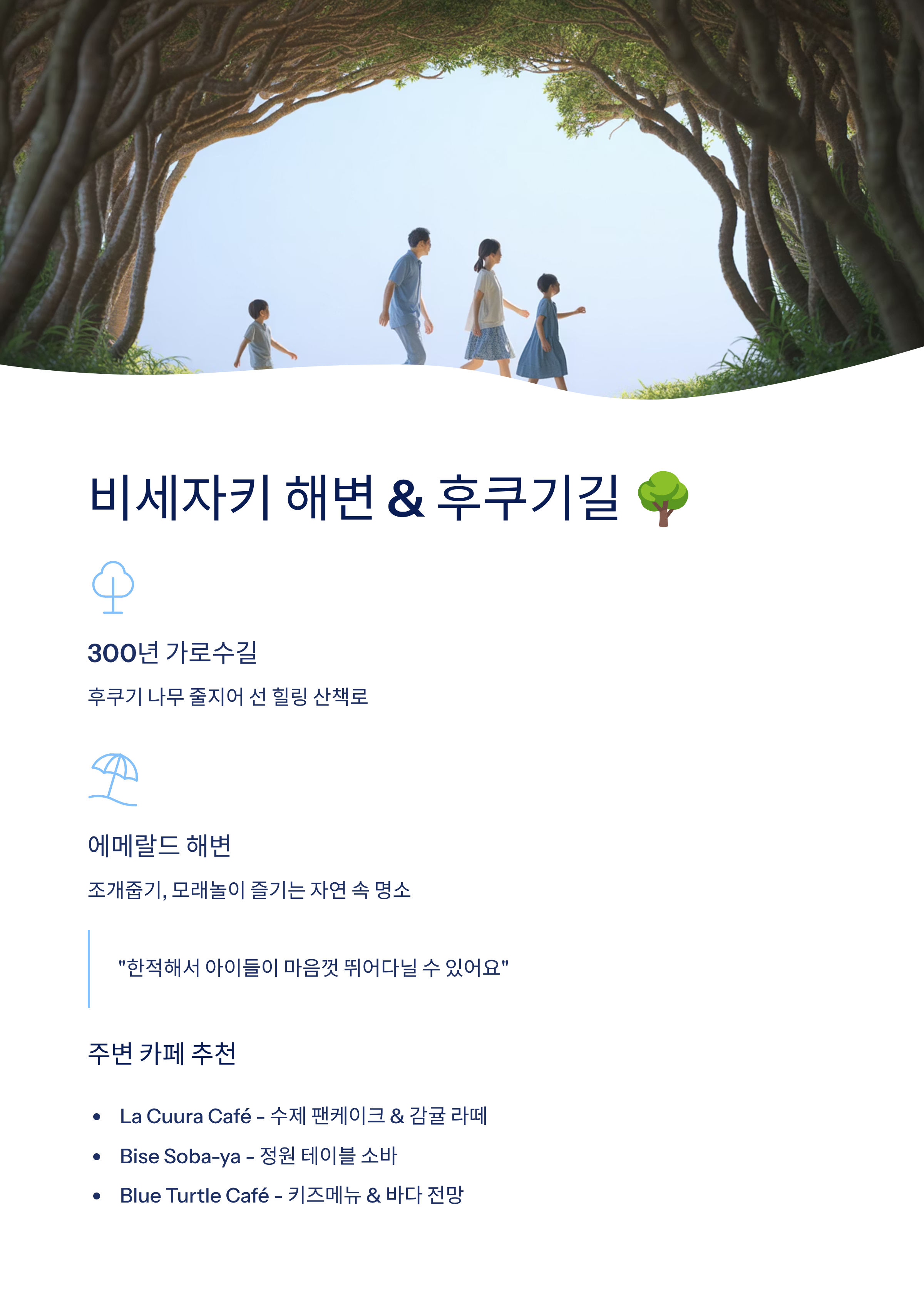오전 츄라우미 수족관 관람 → 카페 우카비 브런치 오키나와 어린이왕국에서 동물 교감 체험 점심 이토만 소바 or 비세 소바야 타코스야 츄에서 부드러운 타코 오후 비세 해변 산책 → 아메리칸 빌리지 쇼핑 및 관람차 오키나와 월드 동굴 탐험 + 전통의상 체험 저녁 포트사이드 카페에서 석양 감상 + 야경 카페 난지라에서 디저트 & 감귤 음료 후 공항 이동