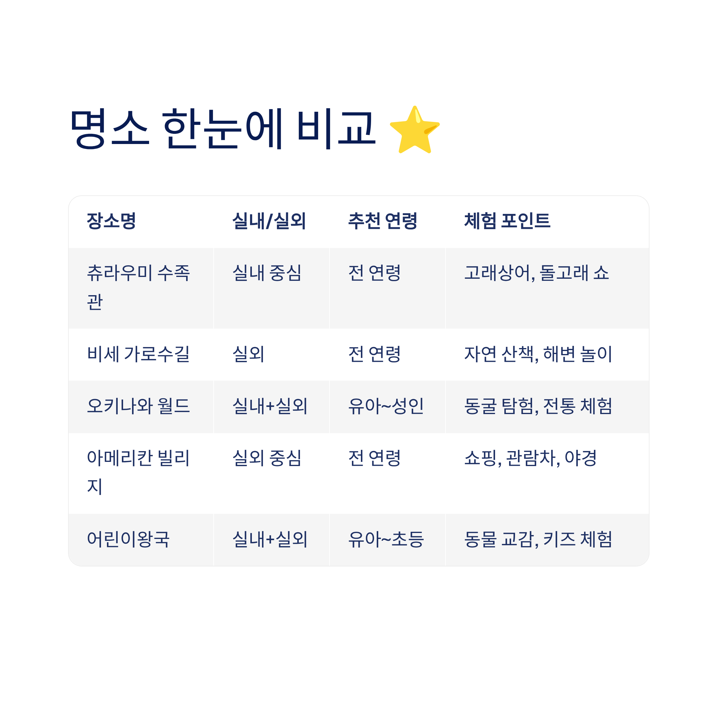 츄라우미 수족관 실내 중심 전 연령 고래상어 수조, 돌고래 쇼 관람 낮음 비세 가로수길 & 해변 실외 전 연령 자연 산책, 자전거 타기, 해변 모래놀이 중간 오키나와 월드 & 동굴 실내+실외 유아~성인 석회동굴 탐험, 전통의상 체험, 유리공예 낮음 아메리칸 빌리지 실외 중심 전 연령 쇼핑, 거리 음식, 관람차 탑승 중간 오키나와 어린이왕국 실내+실외 유아~초등학생 동물 먹이 체험, 실내 키즈 체험존 낮음 '여행' 카테고리의 다른 글