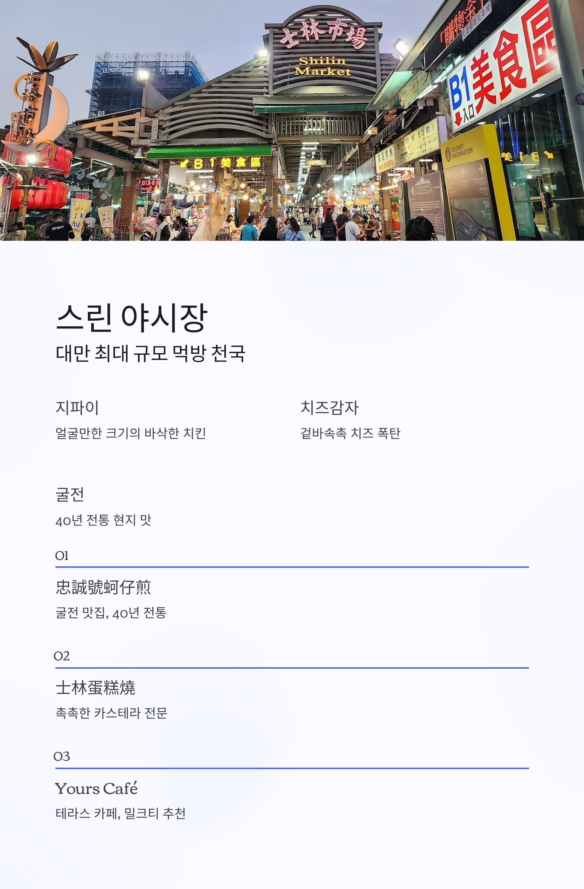 스린 야시장 타이베이 지파이, 치즈감자 가장 크고 다양한 구성 높음 중간 닝샤 야시장 타이베이 후추빵, 땅콩아이스크림 진짜 로컬 미식 천국 최고 중간 류허 야시장 가오슝 굴국수, 해산물, 우육면 따뜻한 남부 분위기 + 노천식 중간 낮음 펑자 야시장 타이중 크로플, 과일 디저트 대학가 감성, 사진 맛집 많음 높음 최고 '여행' 카테고리의 다른 글