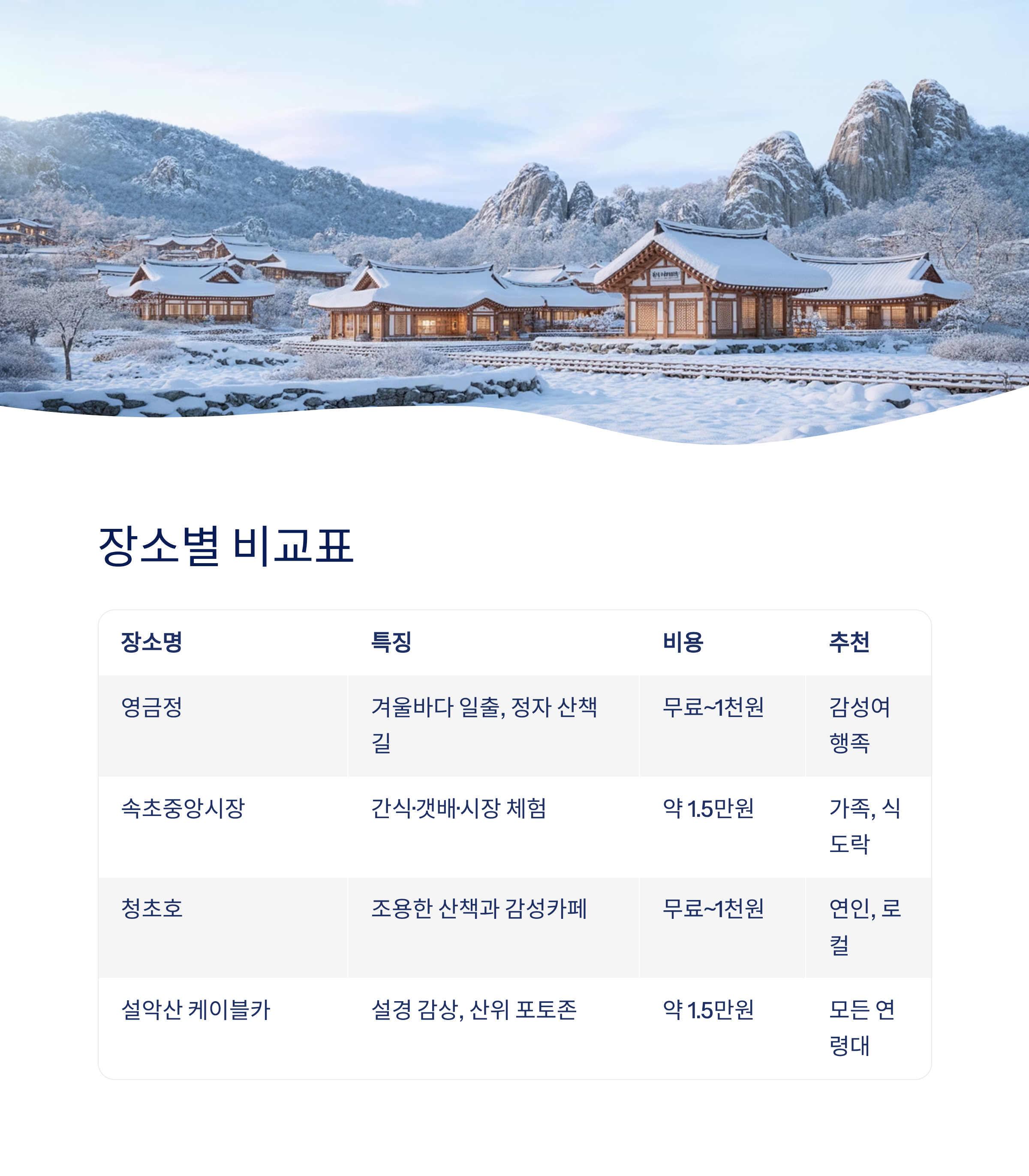영금정 겨울바다 일출, 정자 산책길 무료~1천 원 감성여행족 속초중앙시장 간식·갯배·시장 체험, 전통 분위기 약 1.5만 원 가족, 식도락 여행자 청초호 호수공원 조용한 산책과 감성카페, 야경 무료~1천 원 연인, 로컬 감성족 설악산 케이블카 & 권금성 설경 감상, 산위 포토존, 쉬운 이동 약 1.5만 원 모든 연령대