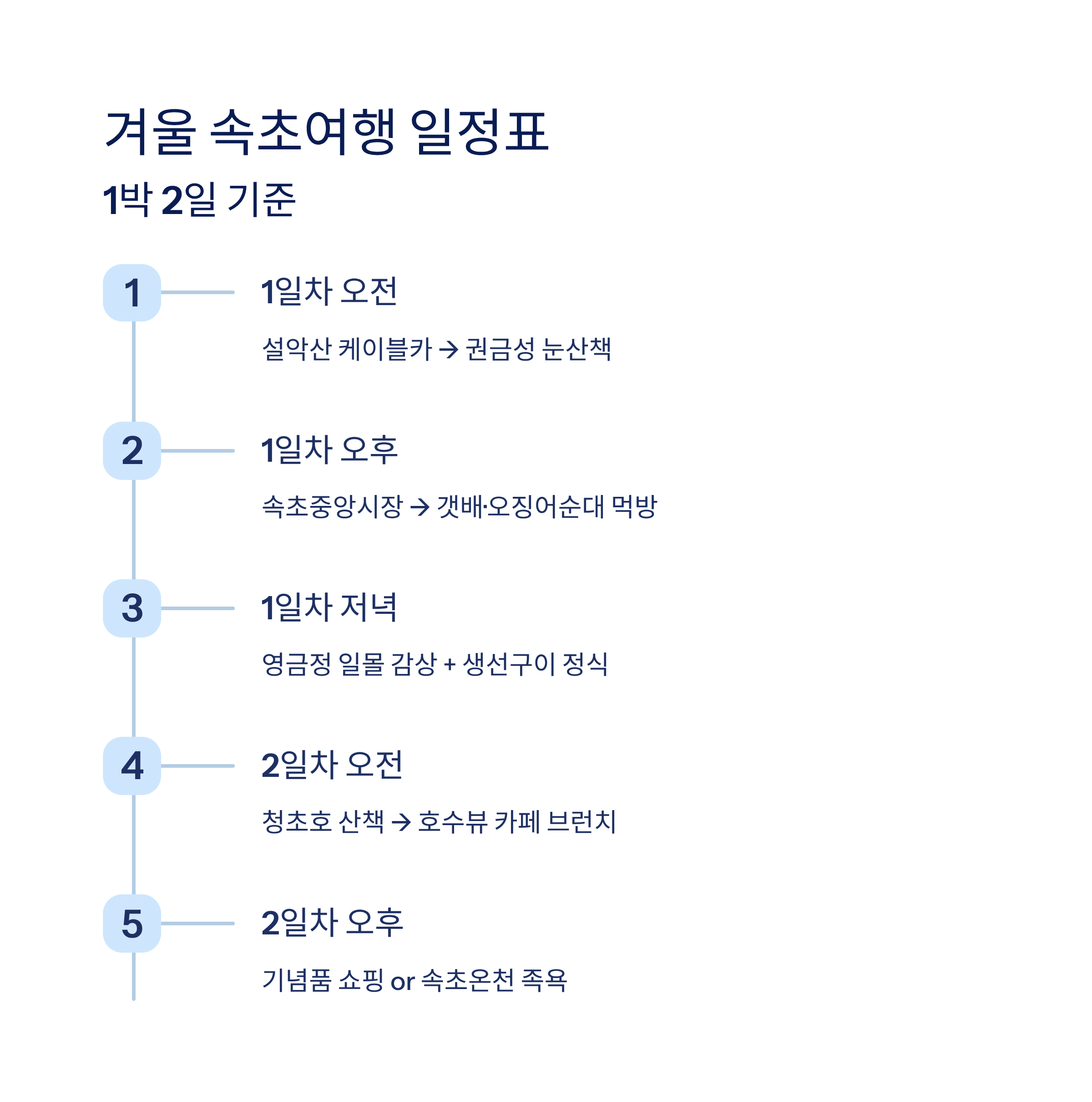 1일차 설악산 케이블카 → 권금성 눈산책 속초중앙시장 → 갯배·오징어순대 먹방 영금정 일몰 감상 + 생선구이 정식 식사 2일차 청초호 산책 → 호수뷰 카페 브런치 기념품 쇼핑 or 속초온천 족욕 체험 귀가 준비