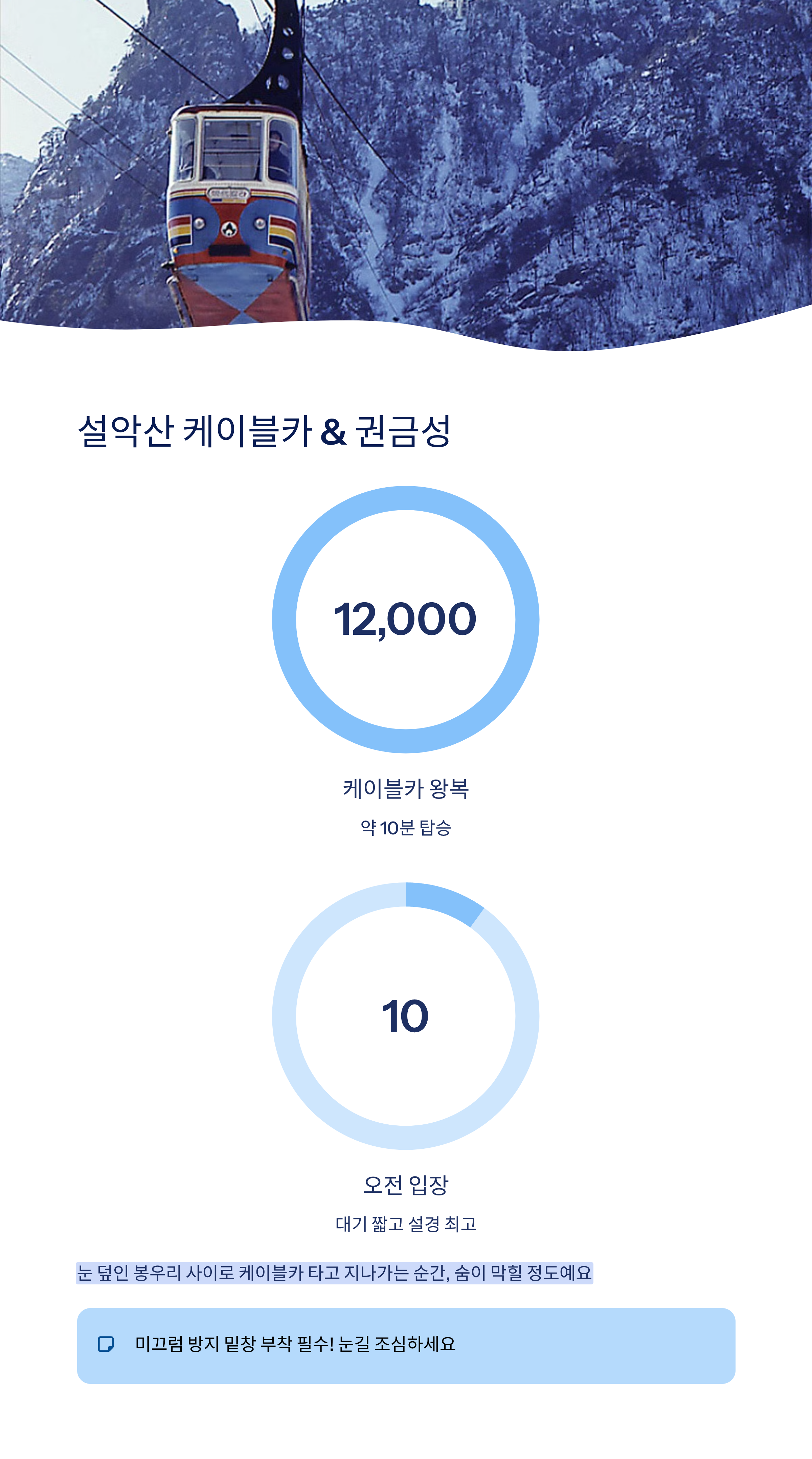 "설악산 눈 덮인 봉우리 사이로 케이블카 타고 지나가는 순간, 그냥 숨이 막힐 정도예요."