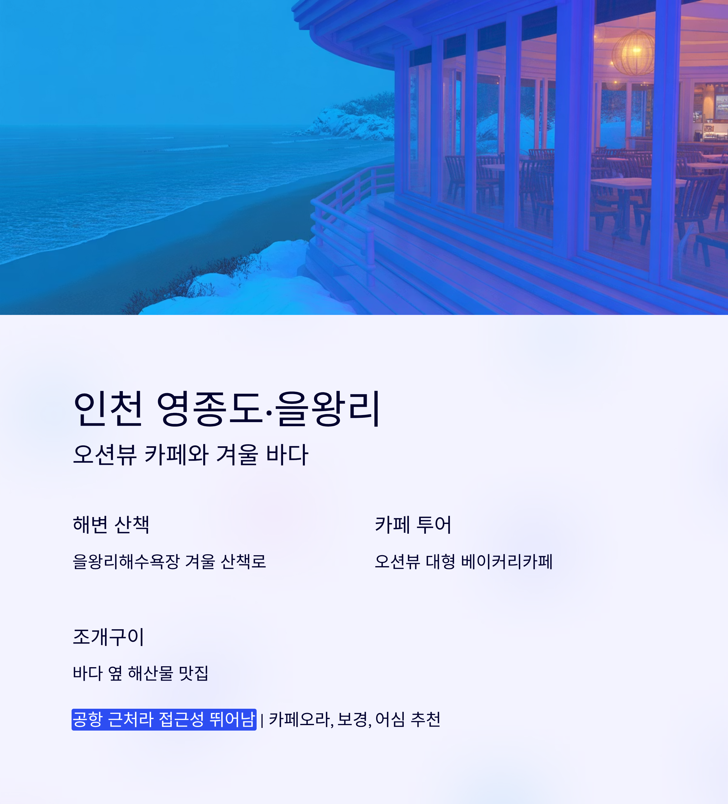 영종도는 공항 근처라 접근성이 뛰어나며, 겨울 바다를 바라보며 커피를 즐기기 좋은 곳입니다. 을왕리해수욕장은 겨울에도 산책객이 많고, 카페거리에는 오션뷰 카페가 가득합니다.