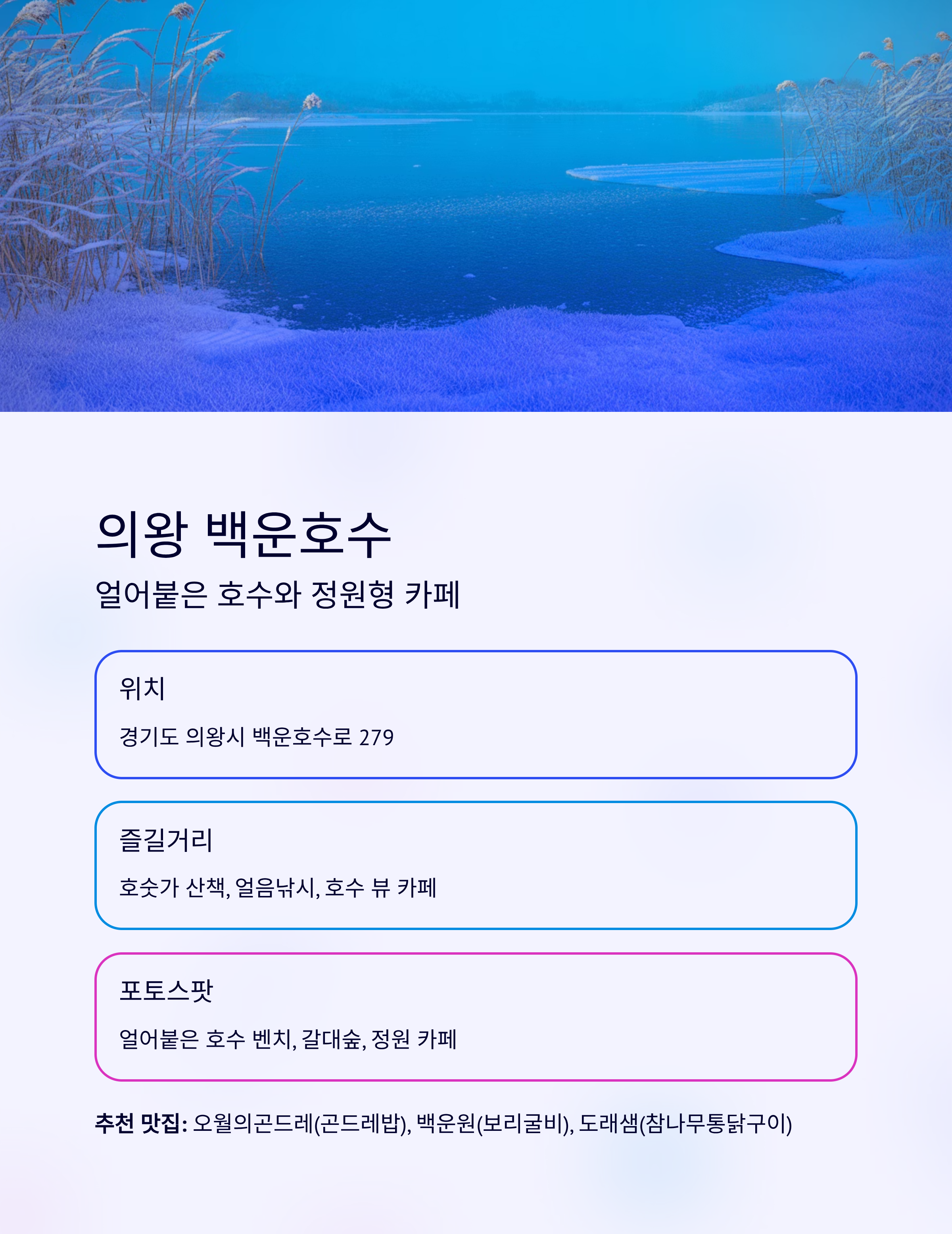 1일차 백운호수 → 대부도 탄도항 호수 산책, 일몰 감상 백운원, 메이플라워카페 2일차 두물머리 → 북한강 드라이브 → 영종도 물안개 포토타임, 리버사이드 카페, 바다 산책 더 그림, 골든트리카페, 카페오라 이번 서울 근교 겨울 드라이브 코스들은 모두 최신 방문자 후기와 지역 공식 관광정보를 바탕으로 검증된 실재 명소들로 구성했습니다.