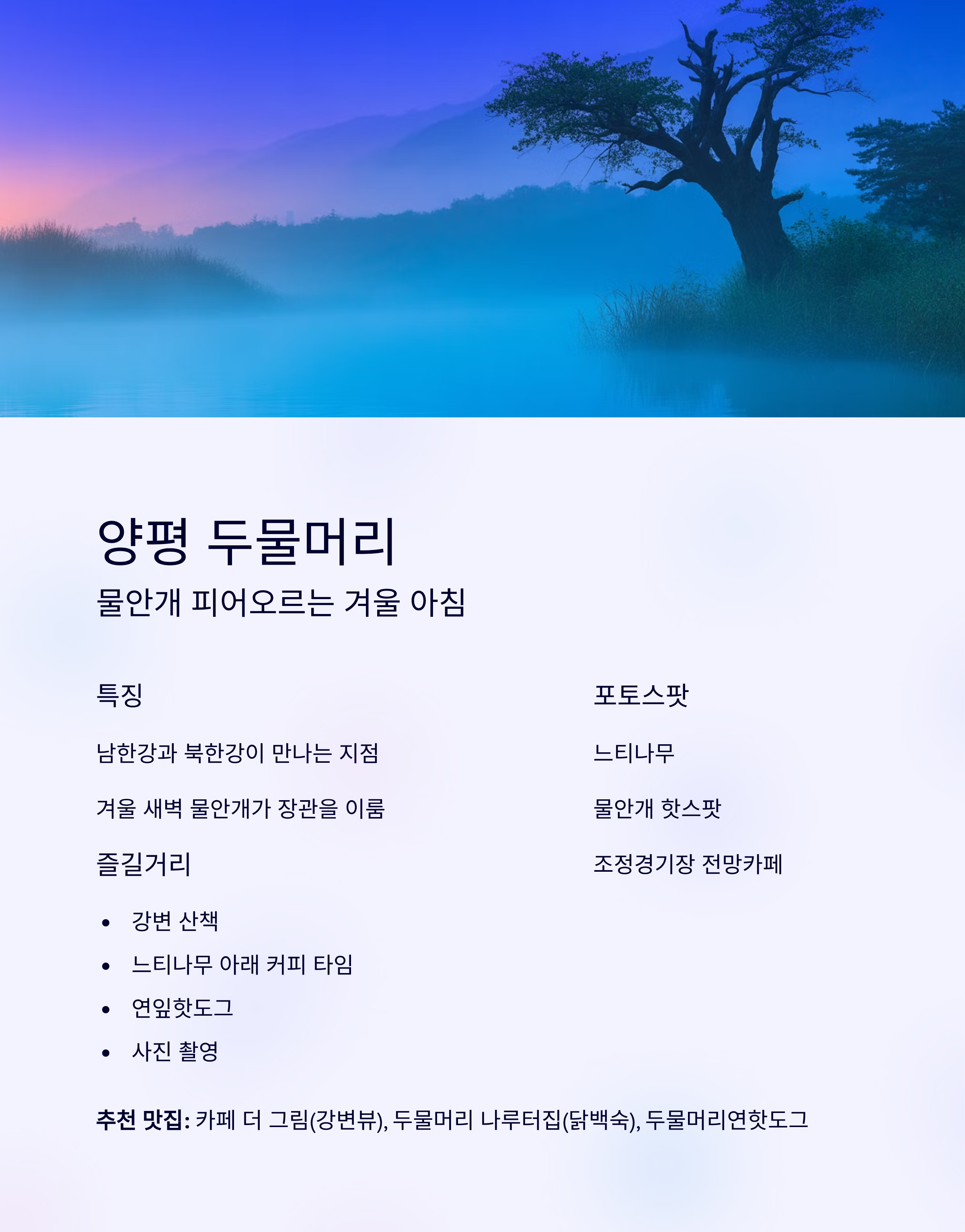 특징: 물안개와 고목나무가 어우러진 대표 감성 포토스팟
