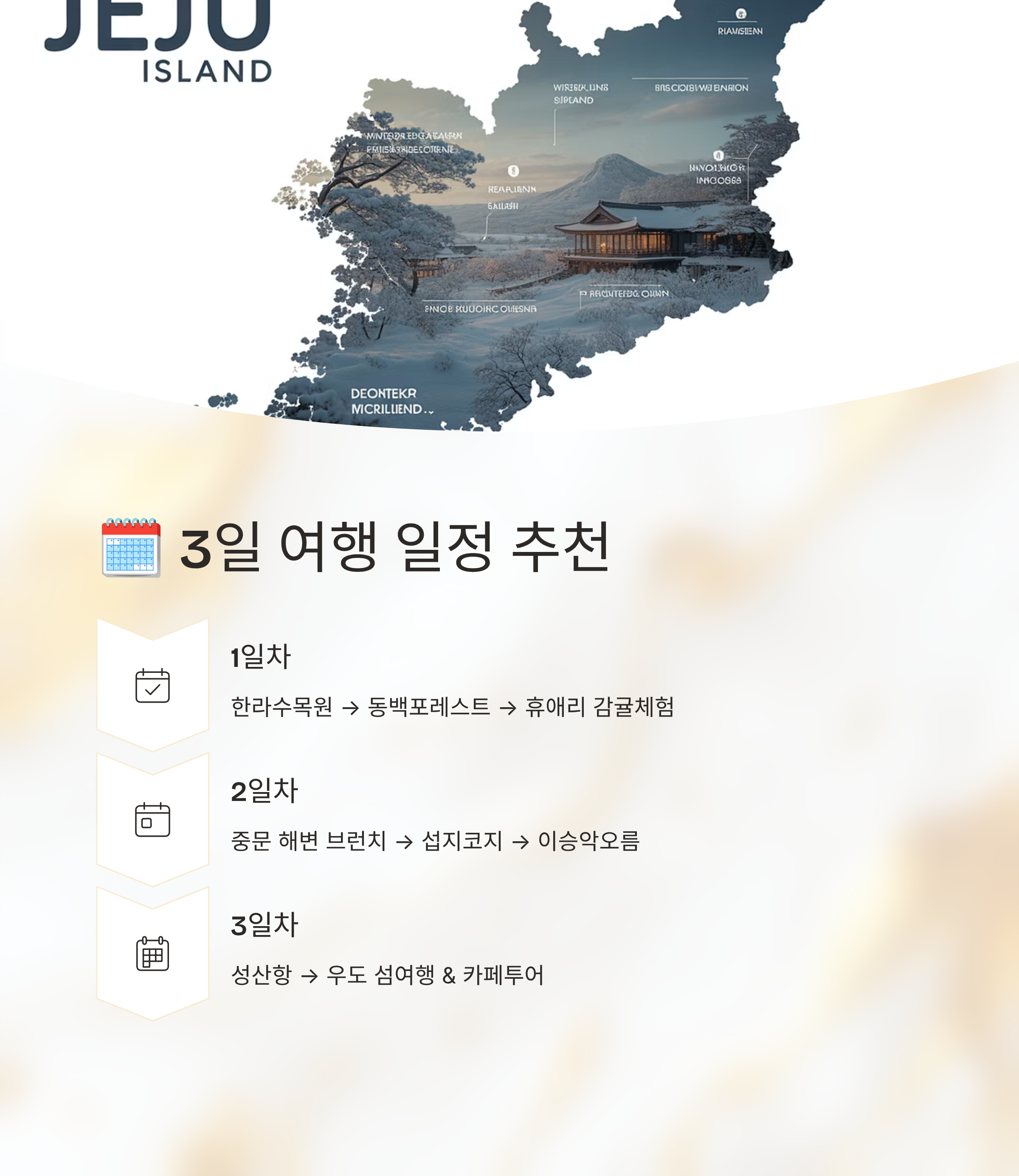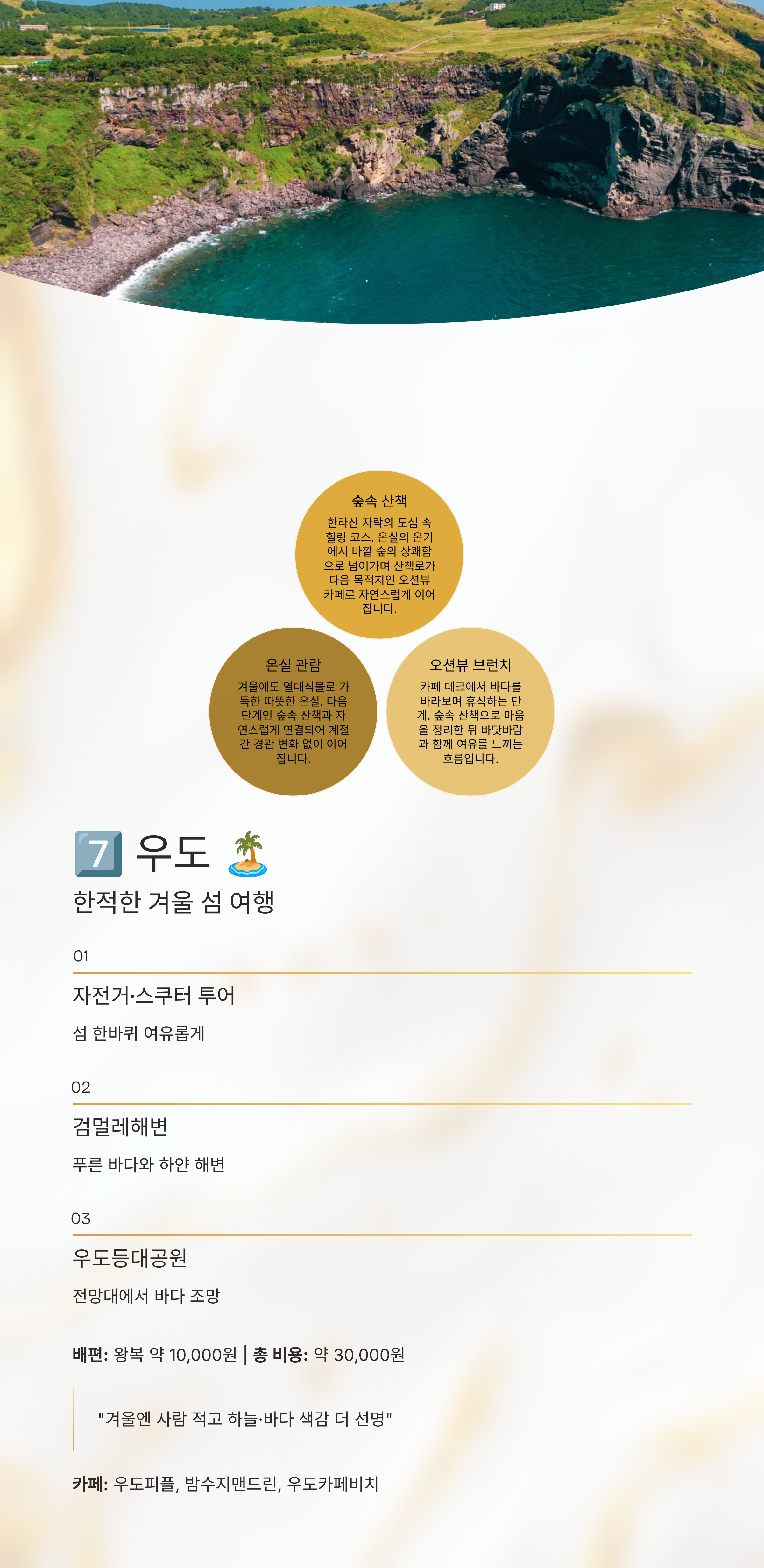 동백포레스트 동백꽃 군락, 포토존 10,000 더로맨틱하우스 / 카페갤러리 / 앙뚜아네트 휴애리 동백·귤 체험, 가족여행 15,000 난산리다방 / 서귀피안베이커리 / 오설록 한라수목원 온실, 빛축제 무료 5L2F / 허니문하우스 / 더클리프 중문관광단지 해변 산책, 오션뷰 무료~ 서연의집 / 원앤온리 / 중문수두리보말칼국수 섭지코지 해안길, 드라마 촬영지 무료 인손 / 카페텐저린 / 모알보알 이승악오름 오름 트레킹, 억새뷰 무료 고국수 / 제주명가본점 / 인샬라 우도 섬여행, 자전거 투어 30,000 우도피플 / 밤수지맨드린 / 우도카페비치