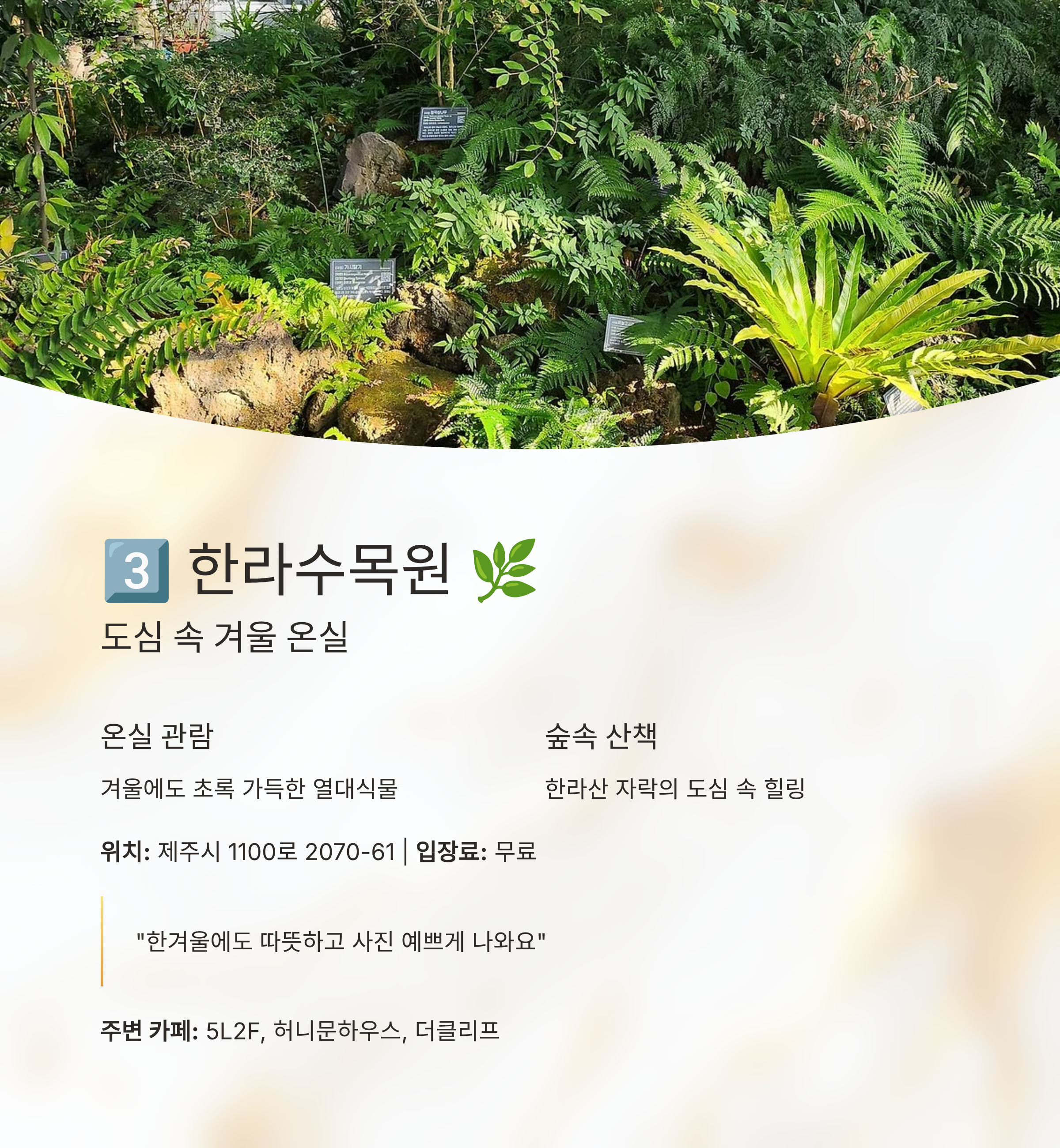 - 특징: 한라산 자락의 도심 속 숲, 겨울에도 초록 가득한 온실