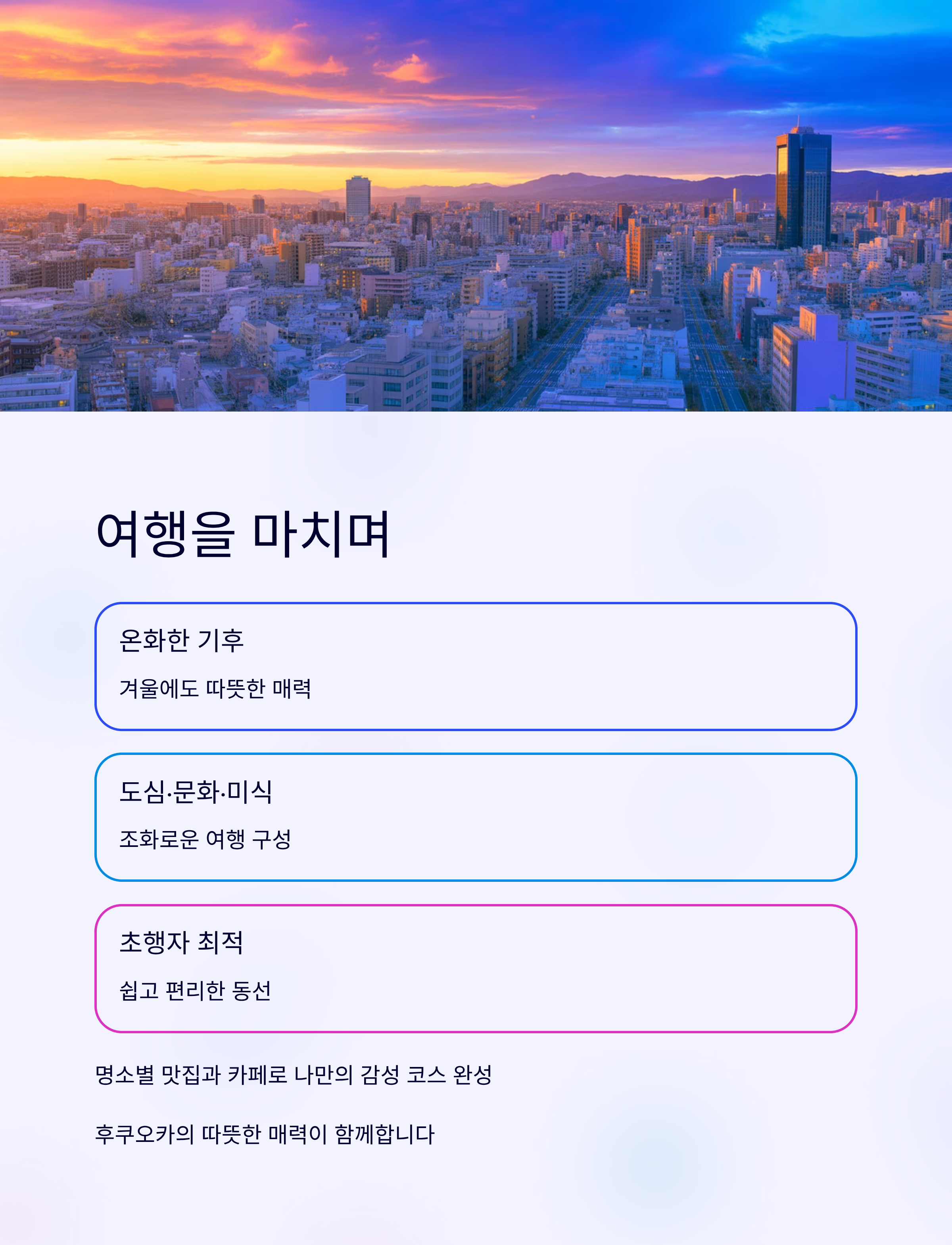 후쿠오카는 겨울에도 온화한 기후와 다채로운 매력으로 가득한 도시입니다. 이번 일정은 도심 관광, 전통 문화, 미식 여행이 조화를 이룬 구성으로, 초행자도 쉽게 즐길 수 있도록 설계되었습니다. 명소별 추천 맛집과 카페를 참고해 자신만의 감성 코스로 응용해보세요. 여행의 마지막 순간까지 후쿠오카의 따뜻한 매력이 함께할 것입니다.