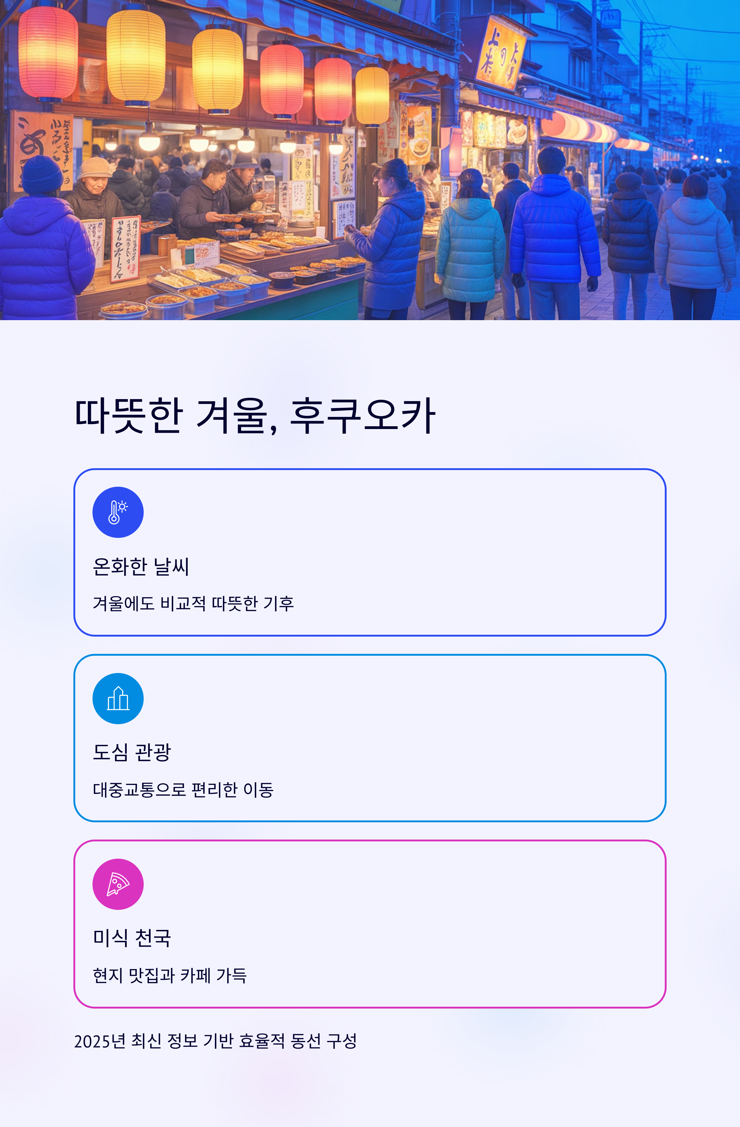 겨울에도 비교적 온화한 날씨를 자랑하는 후쿠오카는 도심 관광과 미식 여행을 동시에 즐길 수 있는 인기 도시입니다. 이번 2박 3일 일정은 대중교통 중심의 효율적인 동선으로 구성되어 있으며, 각 명소별로 카페와 맛집 추천도 함께 정리했습니다. 실제 후기와 최신 정보를 기반으로 하여, 최근기준으로 가장 알찬 코스로 구성되었습니다.