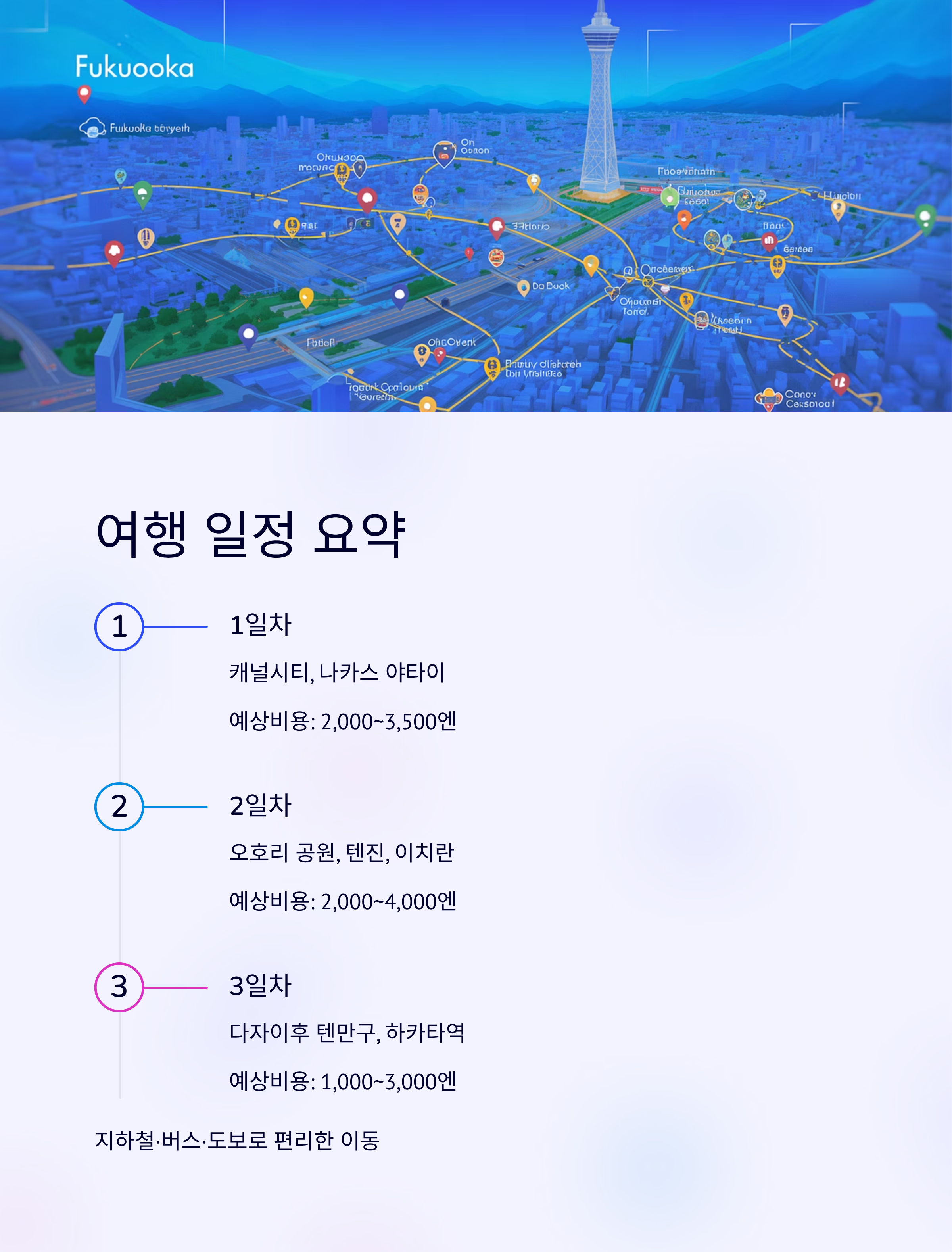 1일차 캐널시티 하카타, 나카스 야타이 거리 한텐우동, 사와노야, 카페 리앤 지하철, 도보 2,000~3,500엔 2일차 오호리 공원, 텐진, 이치란 라멘 REC COFFEE, Manu Coffee, No Coffee 지하철, 버스 2,000~4,000엔 3일차 다자이후 텐만구, 하카타역 하카타잔카이, 토리토리테이, 스타벅스 전철, 도보 1,000~3,000엔