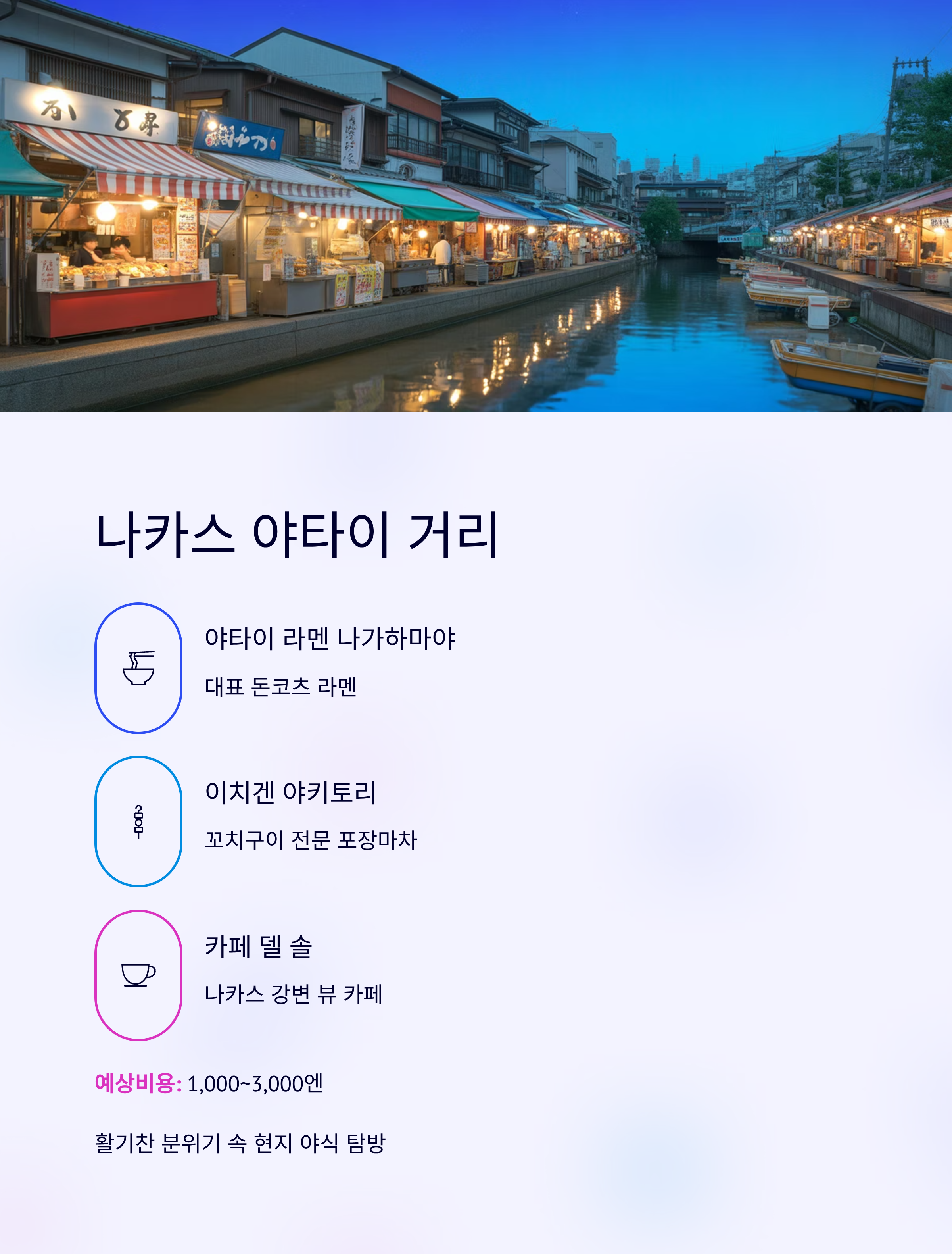 특징: 후쿠오카의 대표 야타이(포장마차) 거리로, 다양한 일본 현지 음식을 맛볼 수 있습니다.