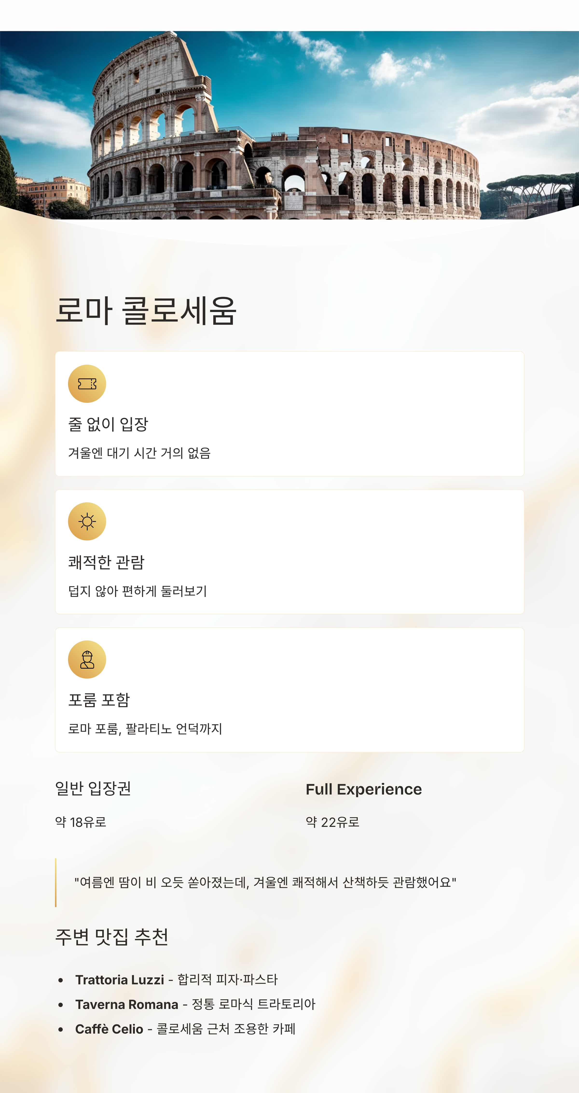 로마의 대표 유적지 콜로세움은 겨울 시즌에 방문하면 “줄 없이 바로 입장”, “덥지 않아서 편하게 관람”이라는 강점이 있습니다.주소