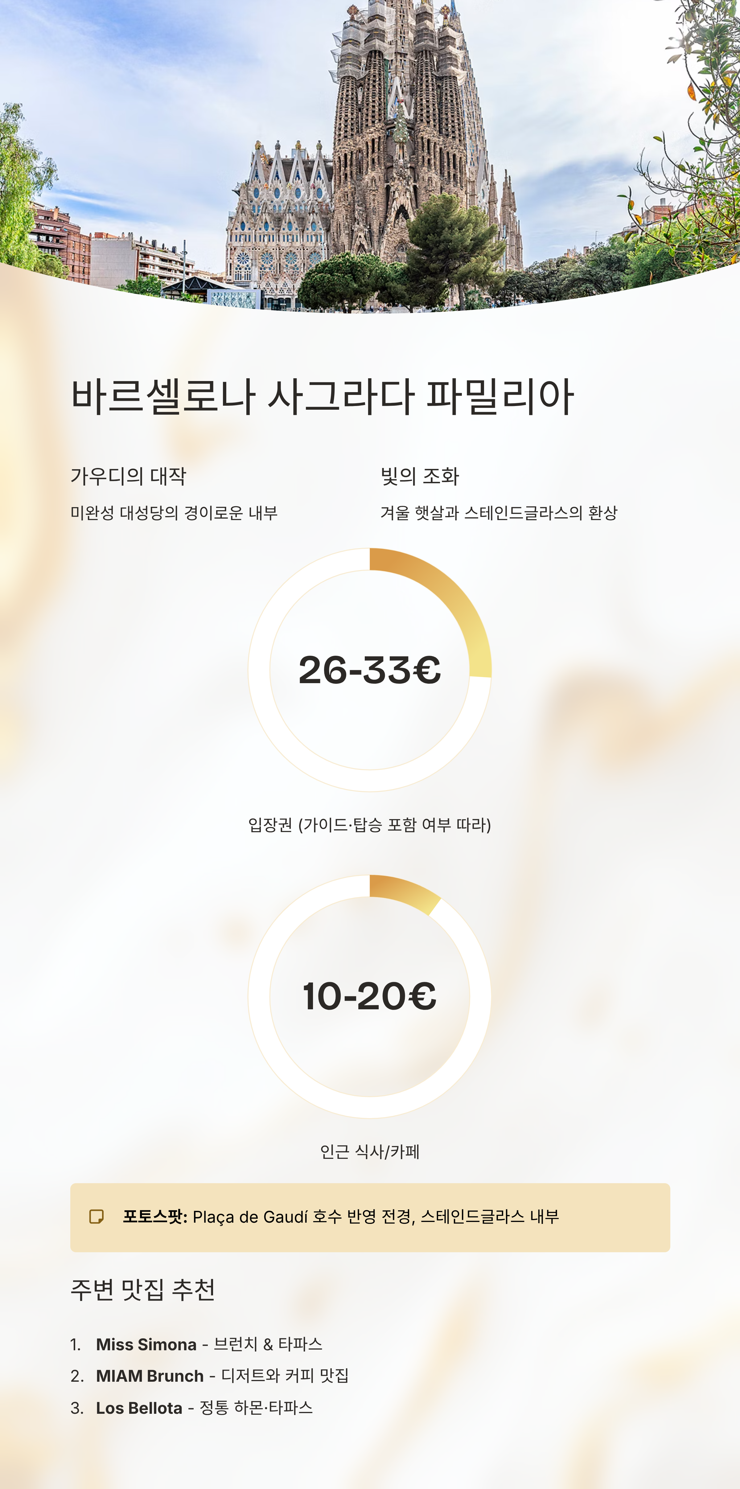1월 바르셀로나는 코트 하나만으로 충분하다는 평가가 많고, "사그라다 파밀리아의 색감이 겨울 햇살과 너무 잘 어울려 일부러 이 시즌을 택했다"는 후기도 자주 등장합니다.주변 맛집 & 카페 추천