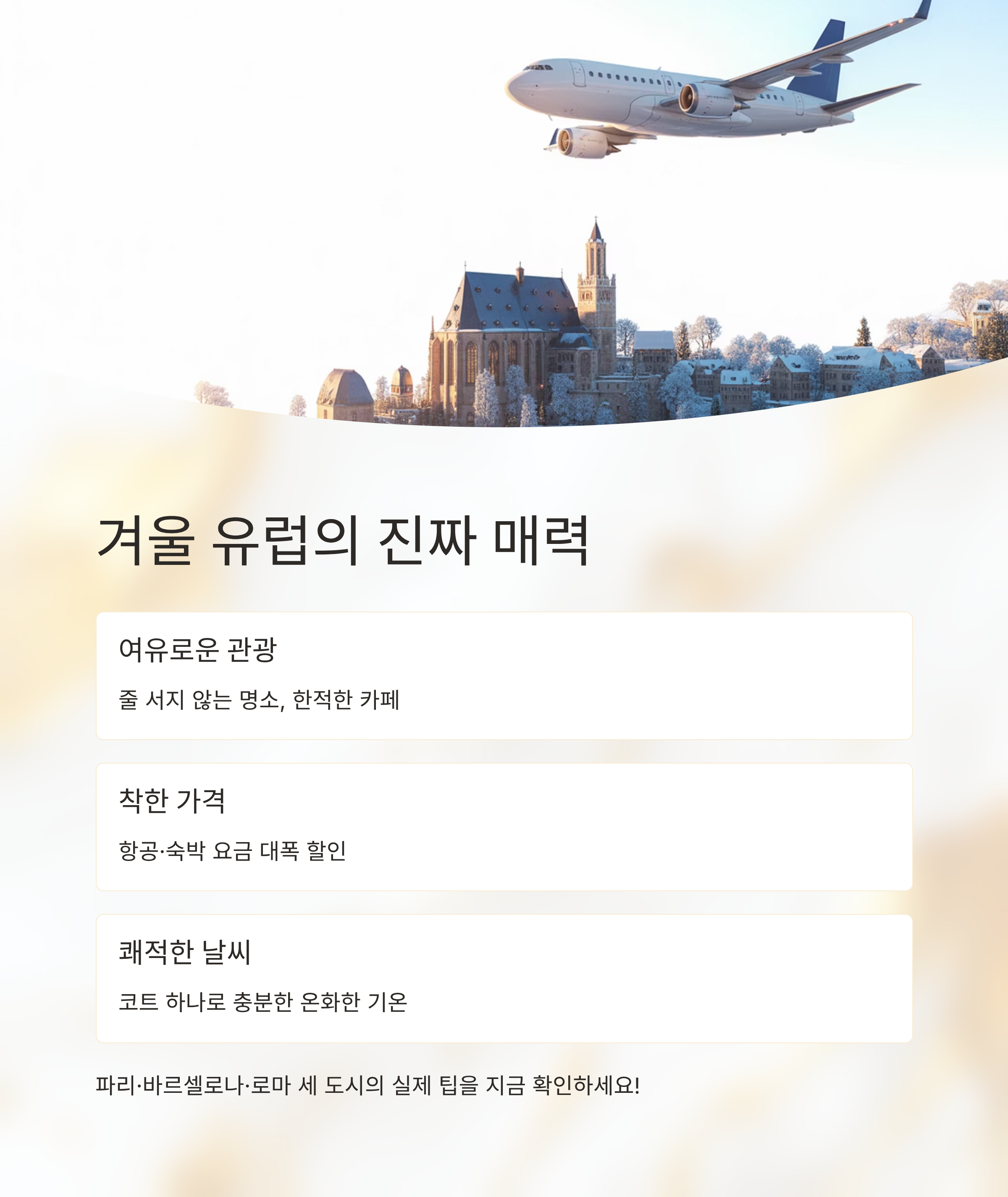 1월과 2월, 많은 이들이 “추울 것 같다”며 여행을 망설이지만, 사실 이 시기는 진짜 여행자들에게는 가장 완벽한 시즌입니다. 줄 서지 않아도 되는 관광지, 떨어진 항공·숙박 요금, 여유로운 카페 시간과 쾌적한 날씨까지. 파리·바르셀로나·로마 세 도시를 중심으로