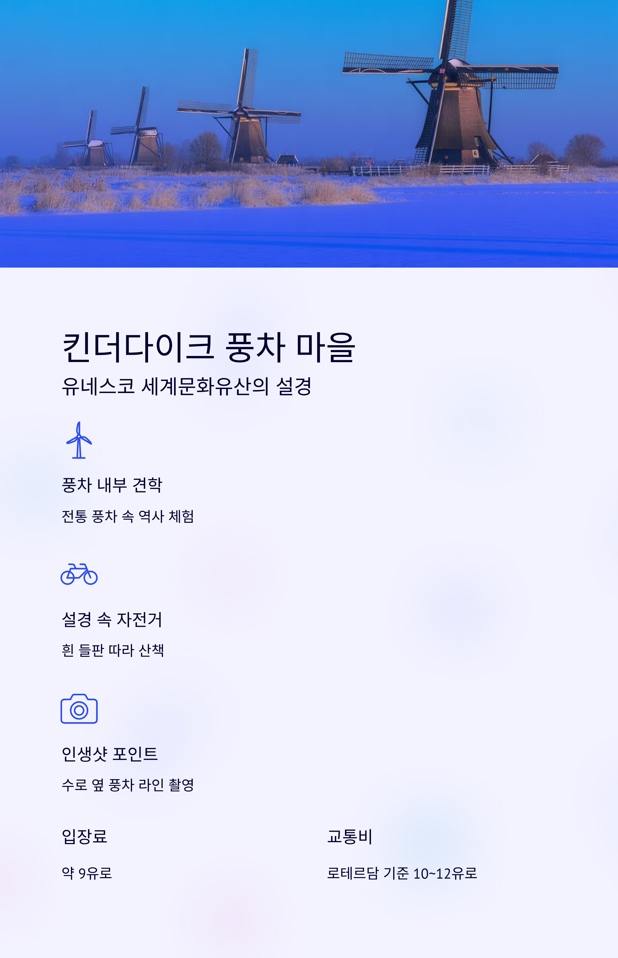 유네스코 세계문화유산이자, 네덜란드 대표 풍차 마을. 겨울에 눈이 내리면, 풍차에 쌓인 눈과 흰 들판이 한 폭의 유화처럼 펼쳐집니다. 겨울철 낮 시간대엔 빛이 맑고 부드러워 사진 찍기에 최적입니다.주소