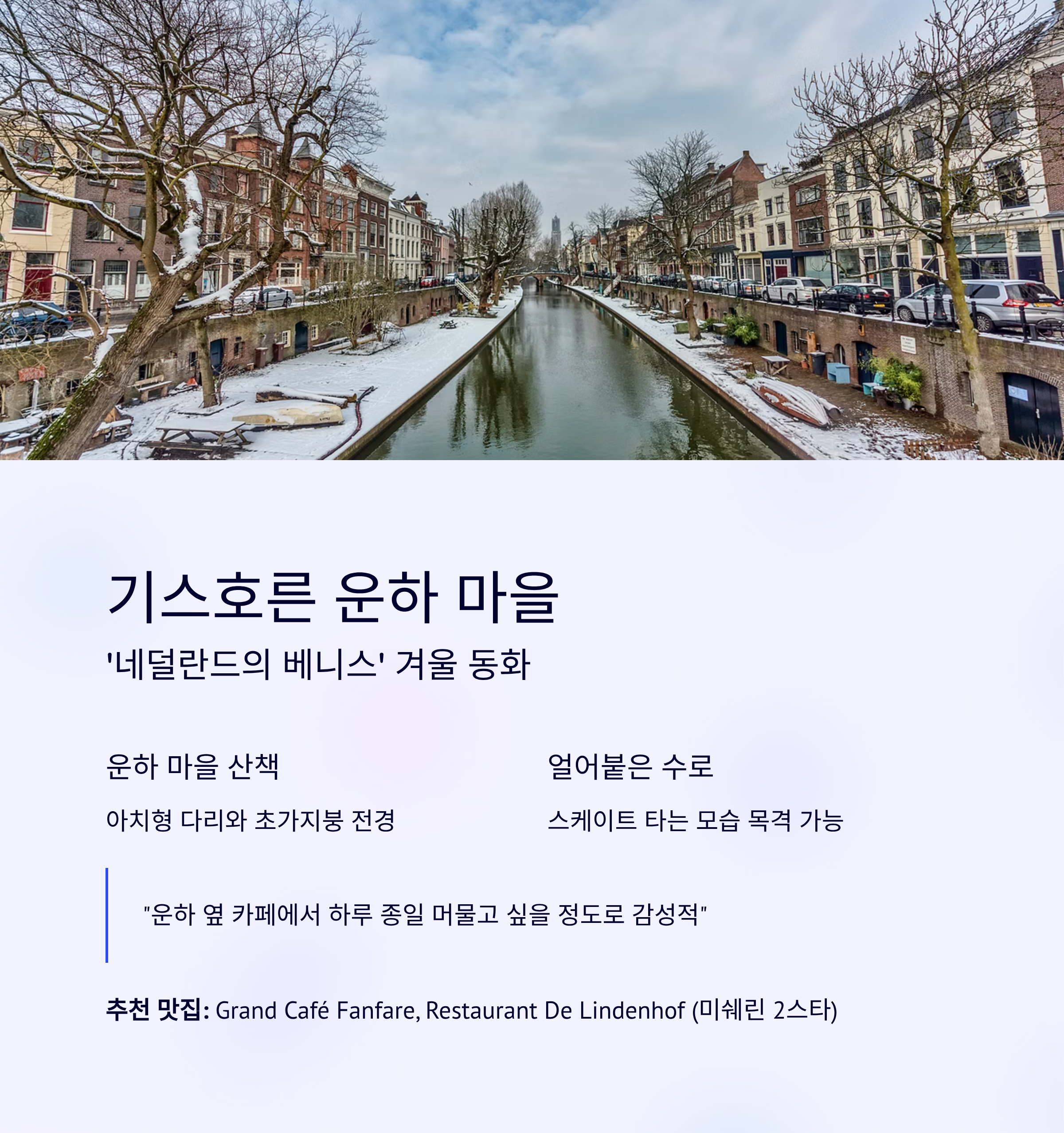 특히 12월부터 2월까지, 네덜란드 전역은 한적한 풍경과 함께 크리스마스 분위기, 겨울 축제, 전통 마을이 어우러져 ‘진짜 유럽 겨울’을 보여줍니다. 이번 글에서는 SNS에서 가장 인기를 끌고 있는 겨울 명소 5곳을 골라, 추천 장소별 정보와 주변 맛집까지 꼼꼼히 정리해 드립니다.