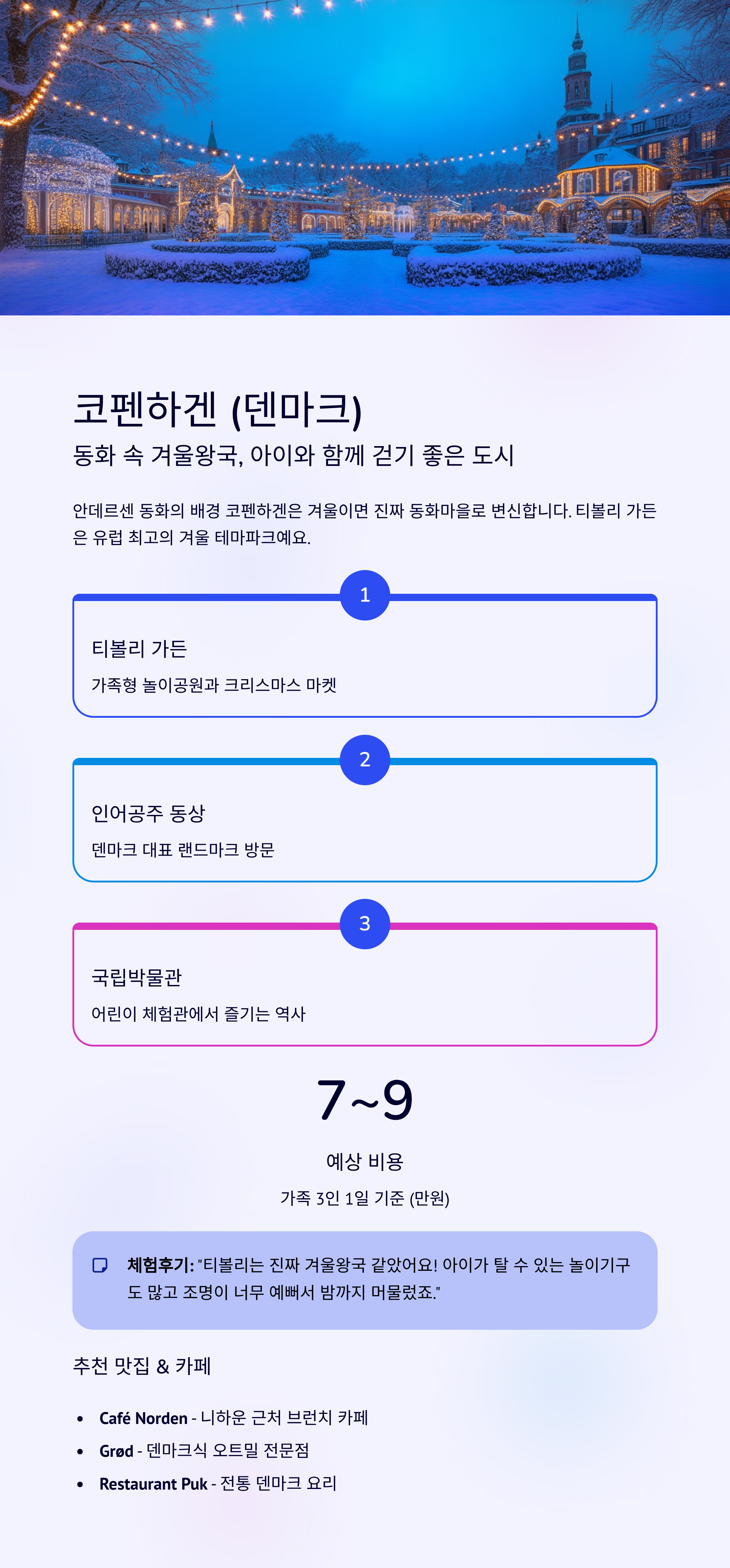 안데르센 동화의 배경이 되는 코펜하겐은 겨울이 되면 진짜 동화마을처럼 변신합니다. 특히 ‘티볼리 가든’은 유럽에서 가장 오래된 놀이공원이자, 겨울엔 눈으로 덮인 환상적인 테마파크로 아이들의 사랑을 독차지해요.