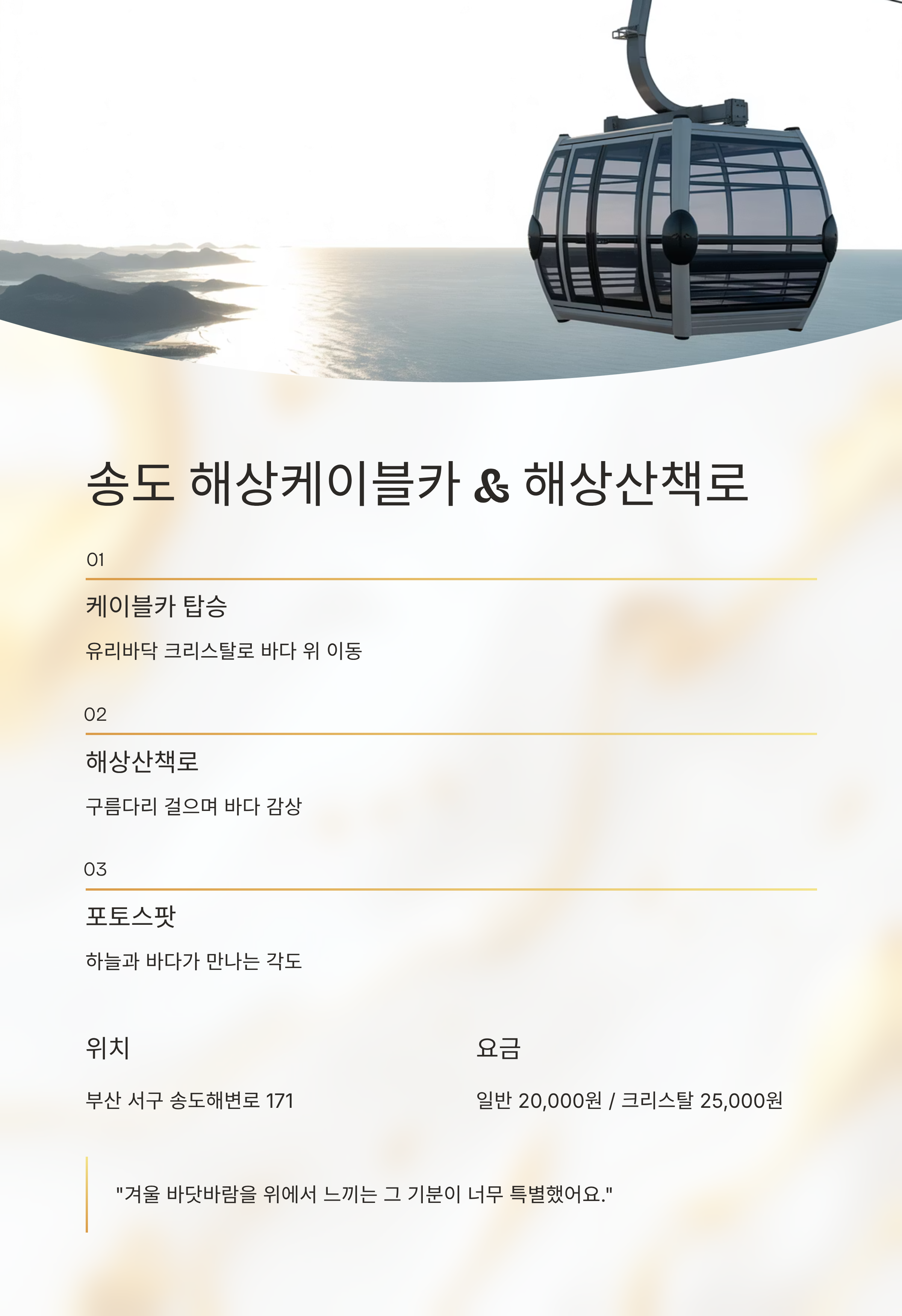 "겨울 바닷바람을 위에서 느끼는 그 기분이 너무 특별했어요. 해상 산책로도 조용해서 데이트 코스로 최고였어요."맛집 추천