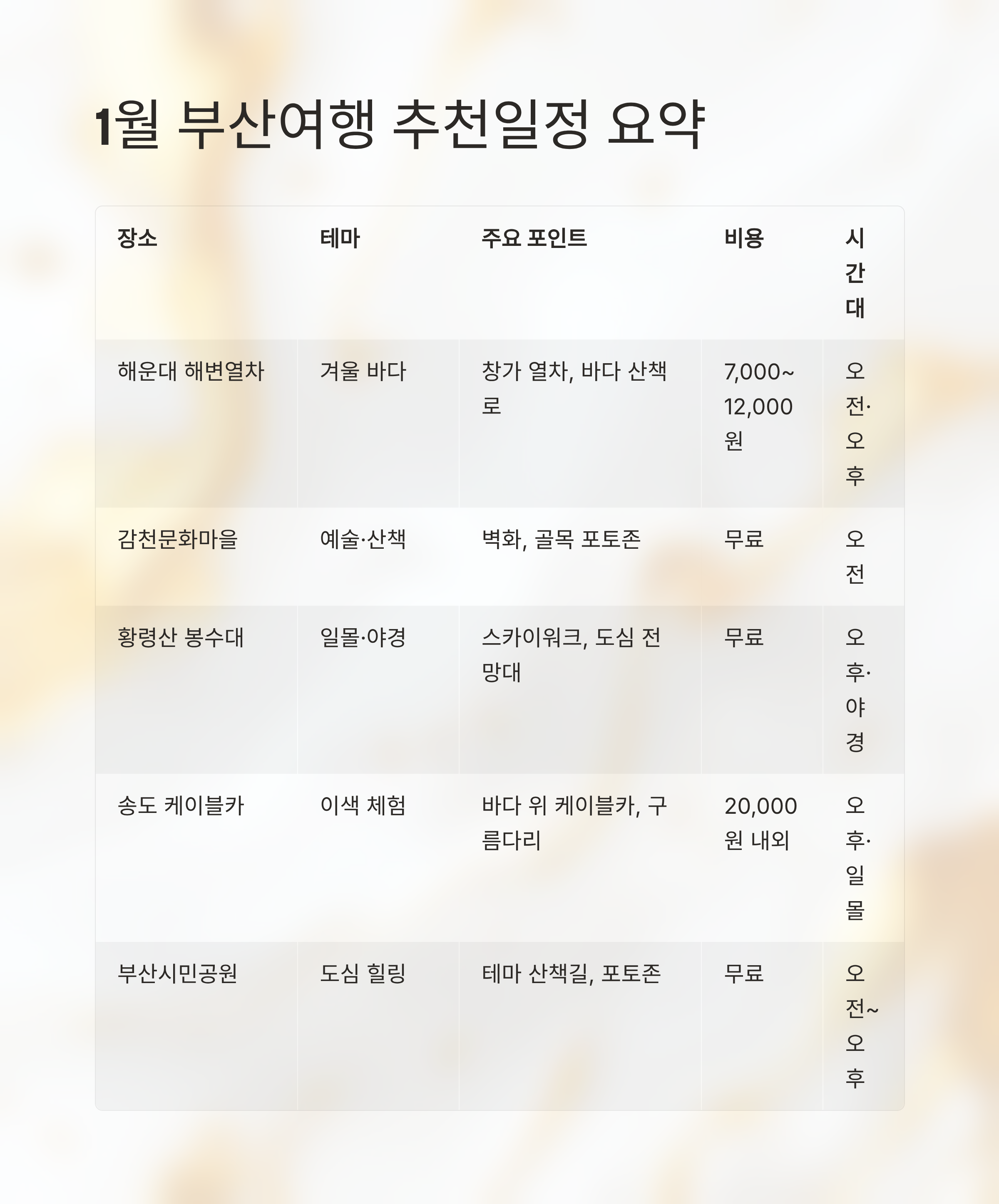 해운대 해변열차 겨울 바다 감상 창가 열차, 바다 산책로 7,000~12,000원 오전~오후 감천문화마을 예술+산책 벽화, 골목 포토존 무료 (체험 유료) 오전 황령산 봉수대 일몰·야경 스카이워크, 도심 전망대 무료 오후~야경 송도 케이블카 이색 체험 바다 위 케이블카, 구름다리 20,000원 내외 오후~일몰 부산시민공원 도심 힐링 테마 산책길, 포토존 무료 오전~오후