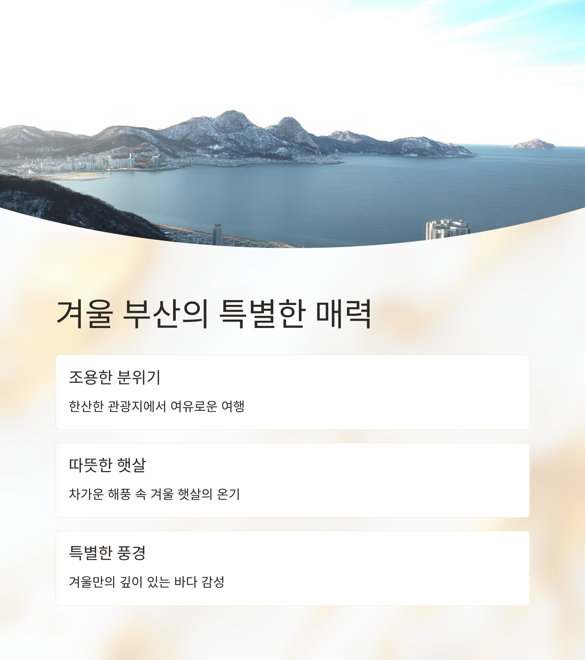 1월 부산여행은 '겨울이라 뭐 하지?'가 아니라 '겨울이라서 더 좋은' 여행이 될 수 있습니다. 차가운 겨울 바다와 한산한 거리, 그리고 따뜻한 맛집들이 만들어내는 조합은 오직 이 시기에만 누릴 수 있는 특권입니다. 무작정 계획 없이 떠나도 충분히 힐링할 수 있지만, 위 일정표대로 하루 두세 군데만 돌아봐도 여행의 만족도가 훨씬 높아질 거예요. 바다만 있는 도시가 아니라는 걸, 이번 1월 부산이 보여줄 겁니다.