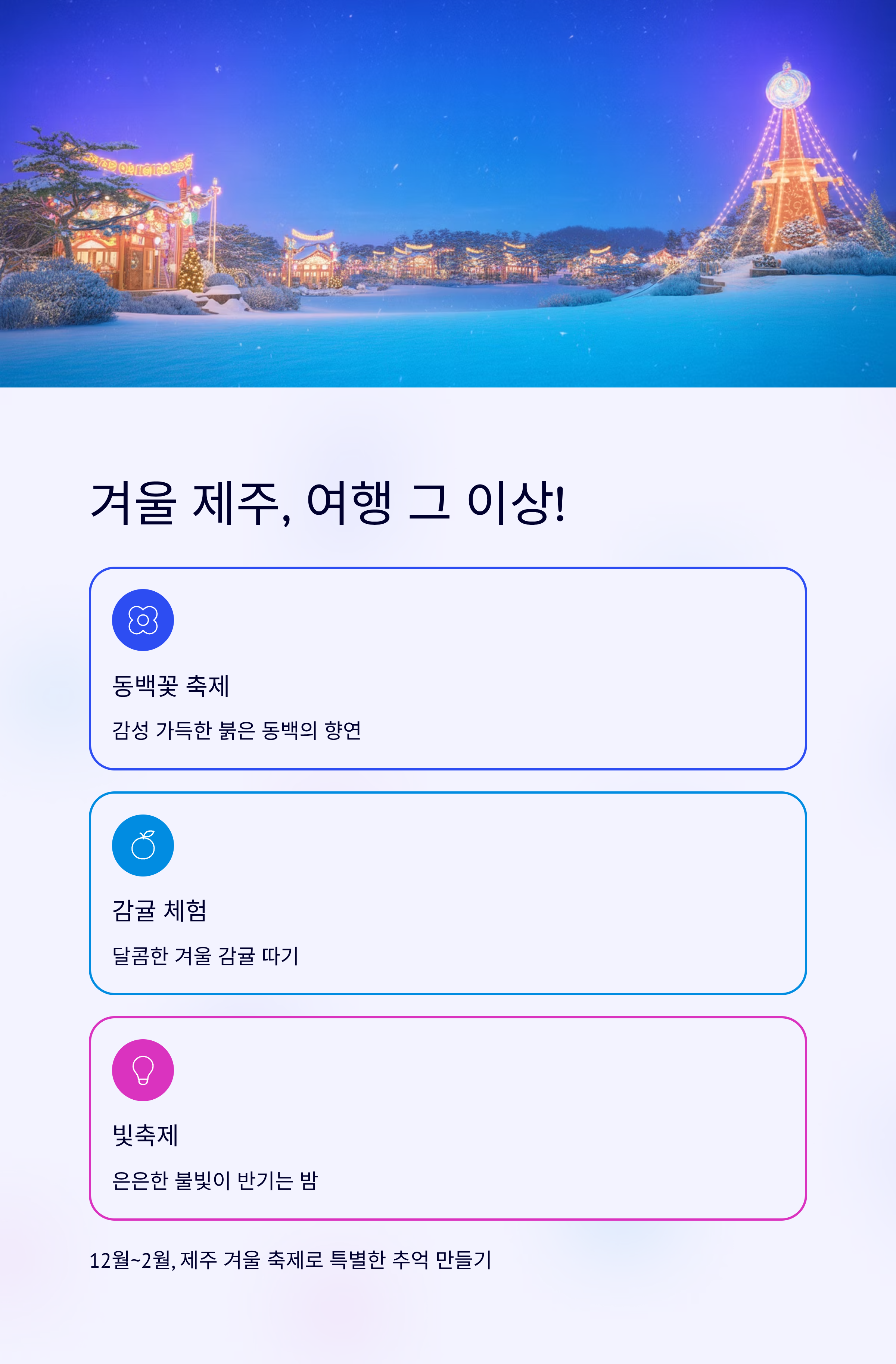 겨울의 제주는 조용한 자연과 함께 다양한 계절 축제들로 또 다른 매력을 보여줍니다. 관광지 외에도 감성 가득한 동백꽃 축제, 맛있는 겨울 감귤 체험, 은은한 불빛이 반기는 빛축제까지. 추운 날씨에도 가족 단위, 연인 여행자들이 계속 제주를 찾는 이유가 여기에 있죠. 오늘은 2025년 12월~2026년 2월 사이 진행되는 제주 겨울 축제 일정과 함께, 각 축제별 위치, 특징, 즐길거리, 입장료, 실제 후기, 주변 맛집까지 꼼꼼히 정리해드립니다. 제주 겨울 여행을 준비 중이라면 이 리스트 한 장으로 계획 끝!