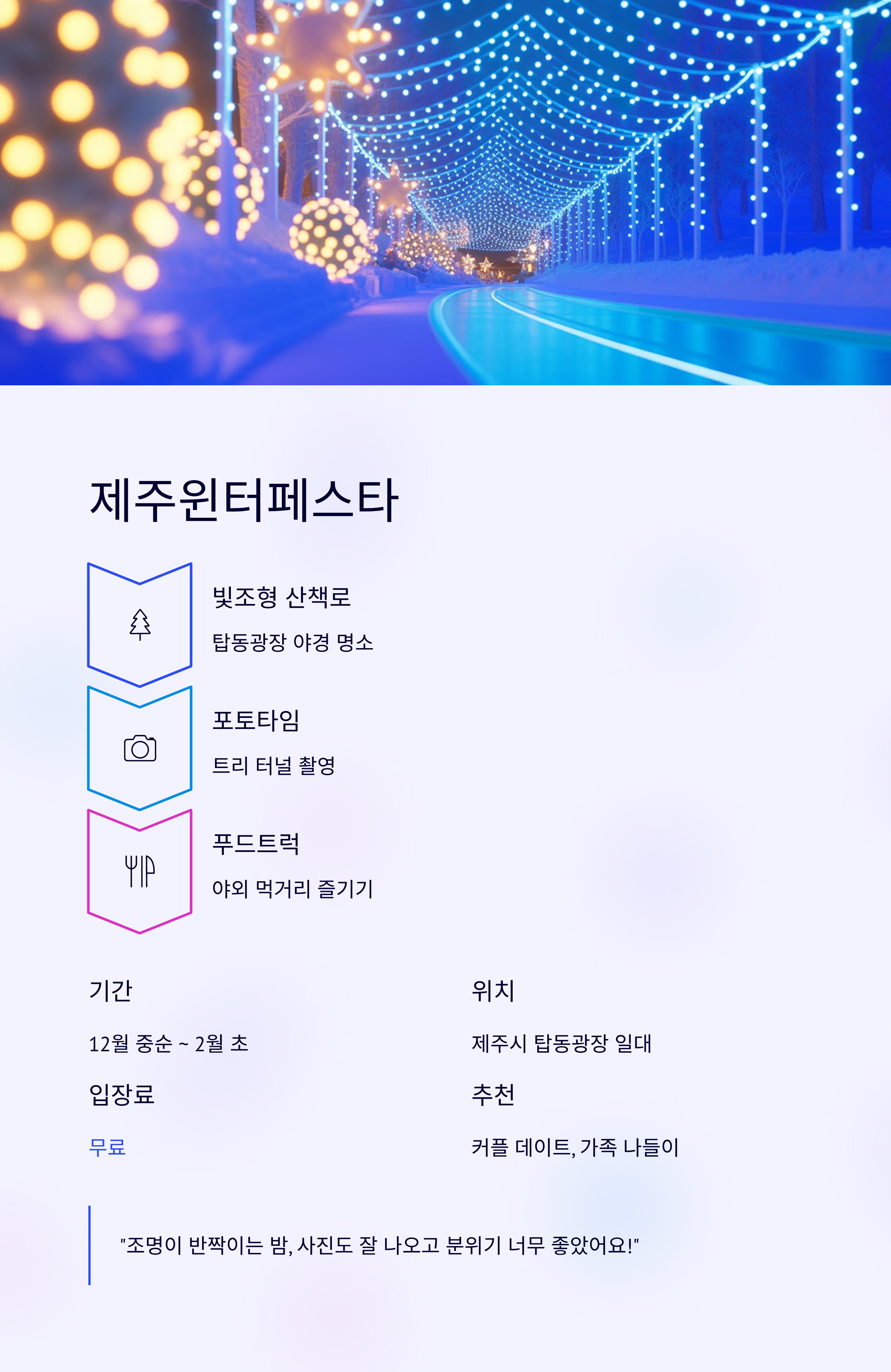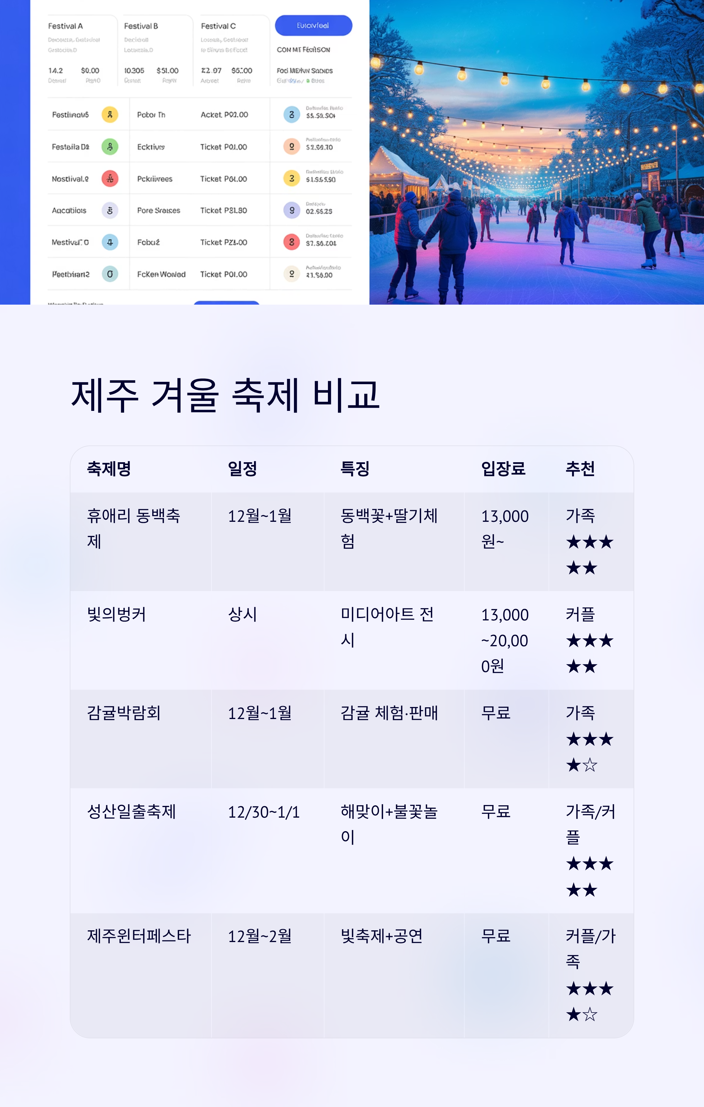 휴애리 동백축제 12월 초 ~ 1월 말 동백꽃+딸기 체험 13,000원~ 가족 ★★★★★ 빛의벙커 전시 상시 (2025~2026 시즌) 미디어아트 실내 전시 13,000~20,000원 커플 ★★★★★ 감귤박람회 12월 중순 ~ 1월 초 감귤 체험, 시식, 판매 무료 (체험 유료) 가족 ★★★★☆ 성산일출축제 12월 30일 ~ 1월 1일 해맞이+불꽃놀이 행사 무료 가족/커플 ★★★★★ 제주윈터페스타 12월 ~ 2월 초 빛축제+푸드트럭+공연 무료 커플/가족 ★★★★☆