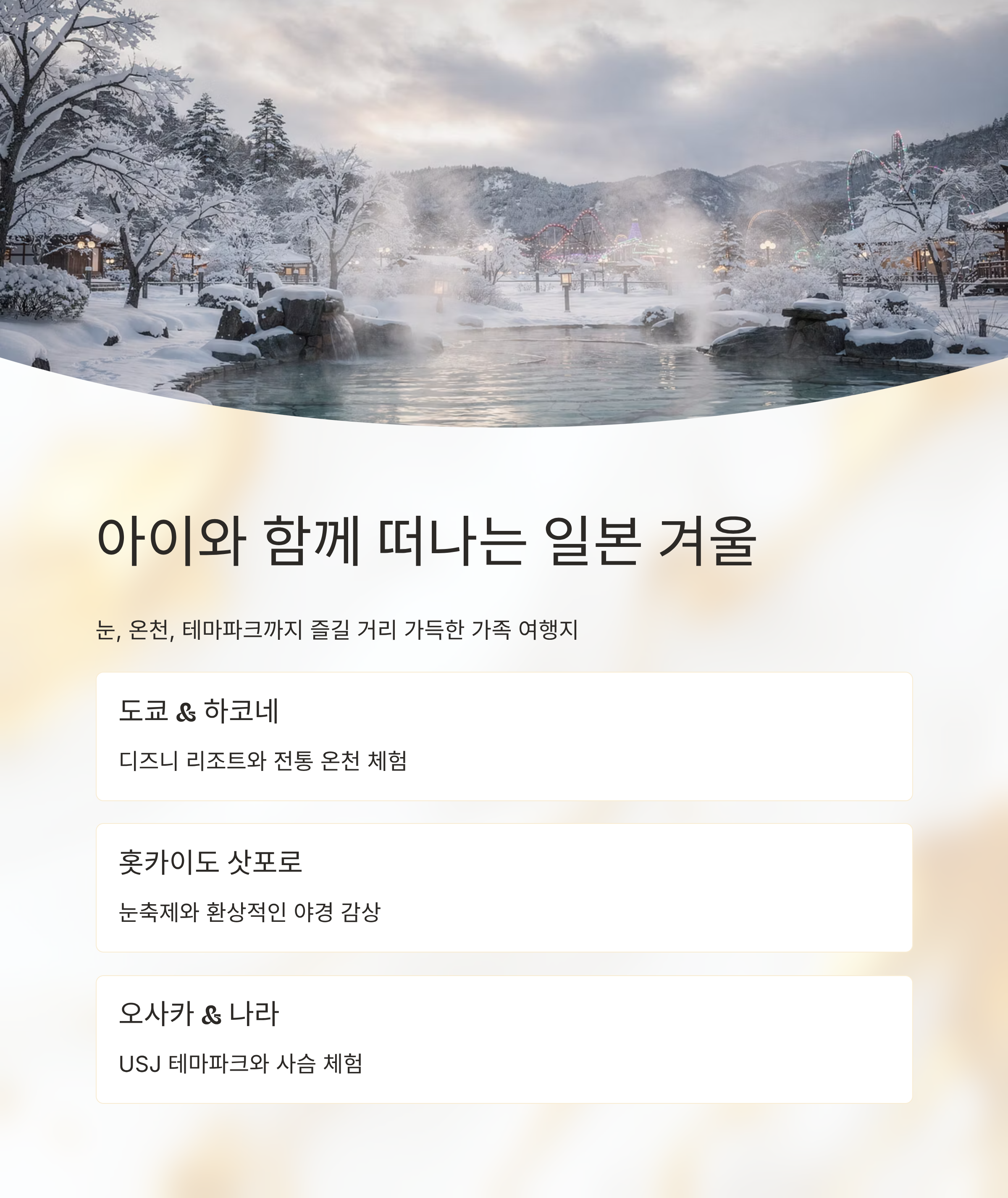 겨울철 일본은 가족 단위 여행객에게 최고의 여행지입니다. 눈, 온천, 캐릭터 테마파크까지 즐길 거리가 가득하죠. 아이들이 좋아할 만한 명소 중심으로 도쿄, 오사카, 홋카이도, 하코네, 나라를 잇는 효율적인 이동 경로와 함께 추천 코스를 정리했습니다. 각 명소에서의 즐길 거리와 포토스팟, 체험후기까지 담았으니 일본 가족여행 계획에 꼭 참고해보세요.