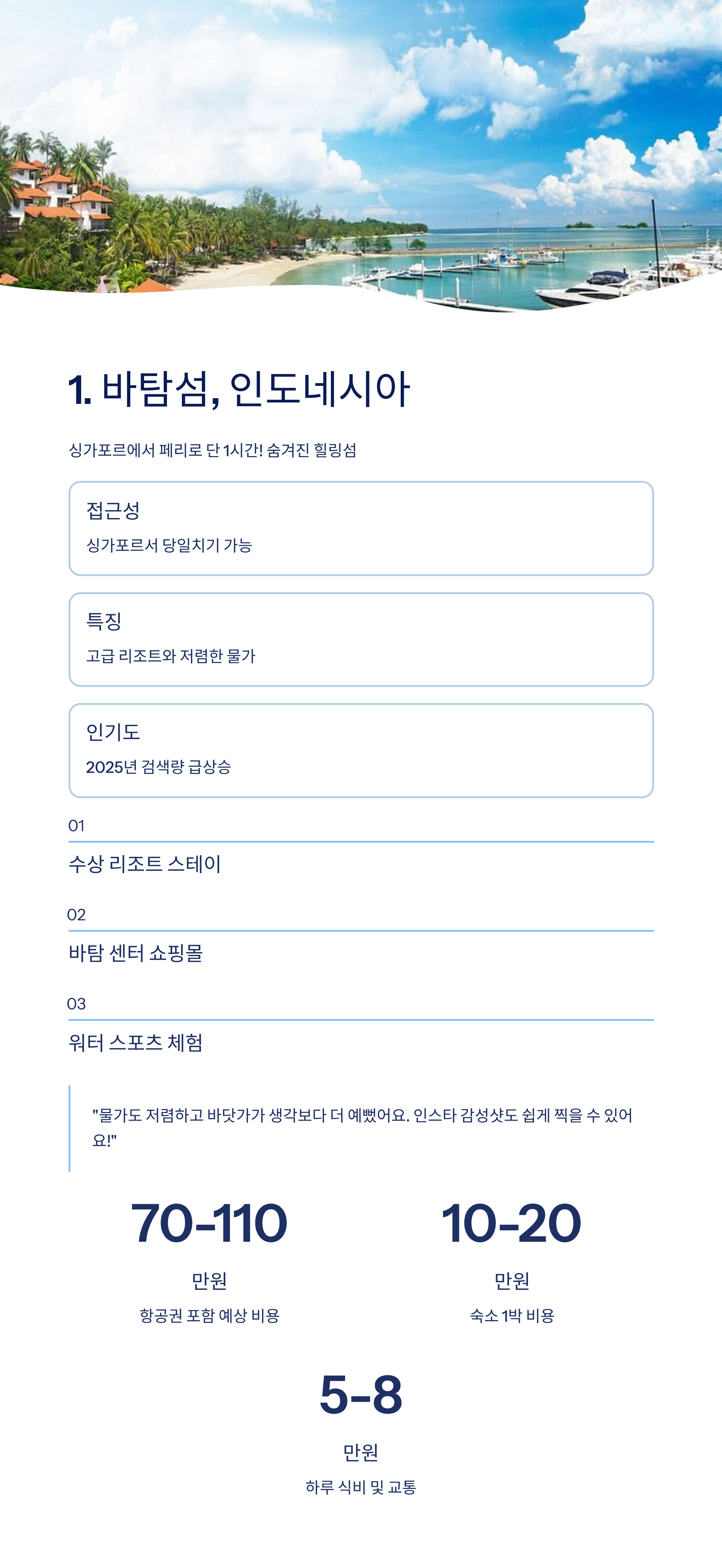 싱가포르에서 페리로 단 1시간! 최근 인스타에서 폭발적으로 인기를 얻고 있는 숨겨진 힐링섬입니다. 고급 리조트와 깔끔한 해변, 저렴한 물가까지 완벽해요.