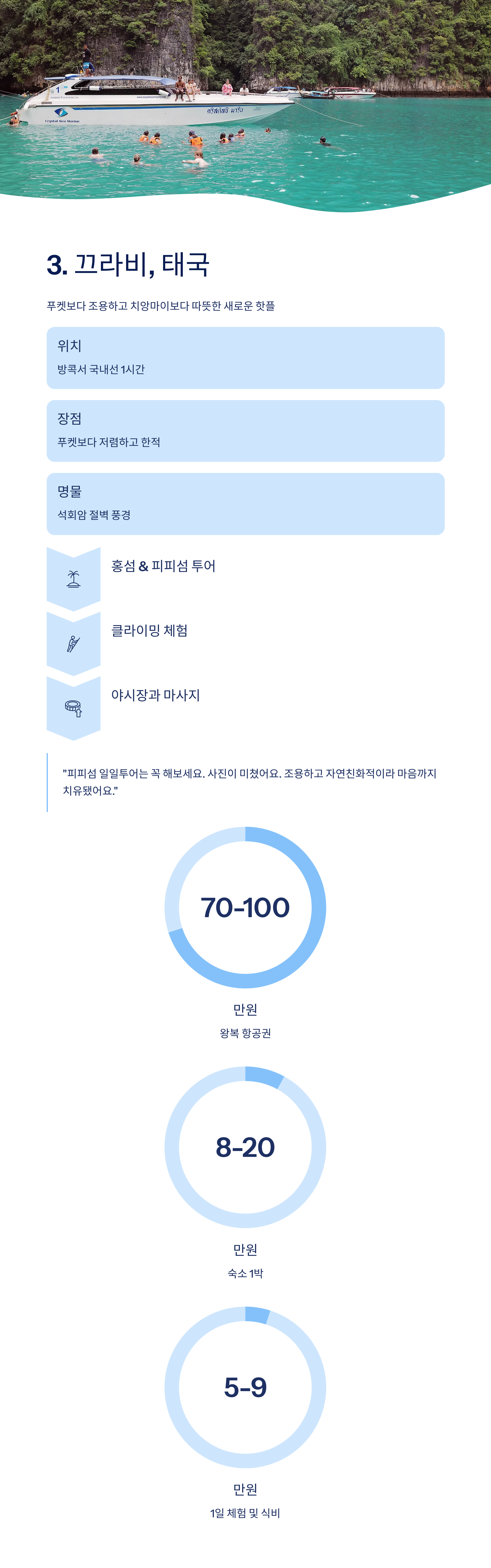 푸켓보다 조용하고 치앙마이보다 따뜻한 이곳, 끄라비는 요즘 젊은 여행자들이 찾는 새로운 핫플입니다. 아오낭 비치와 근교 섬 투어로 유명하죠.