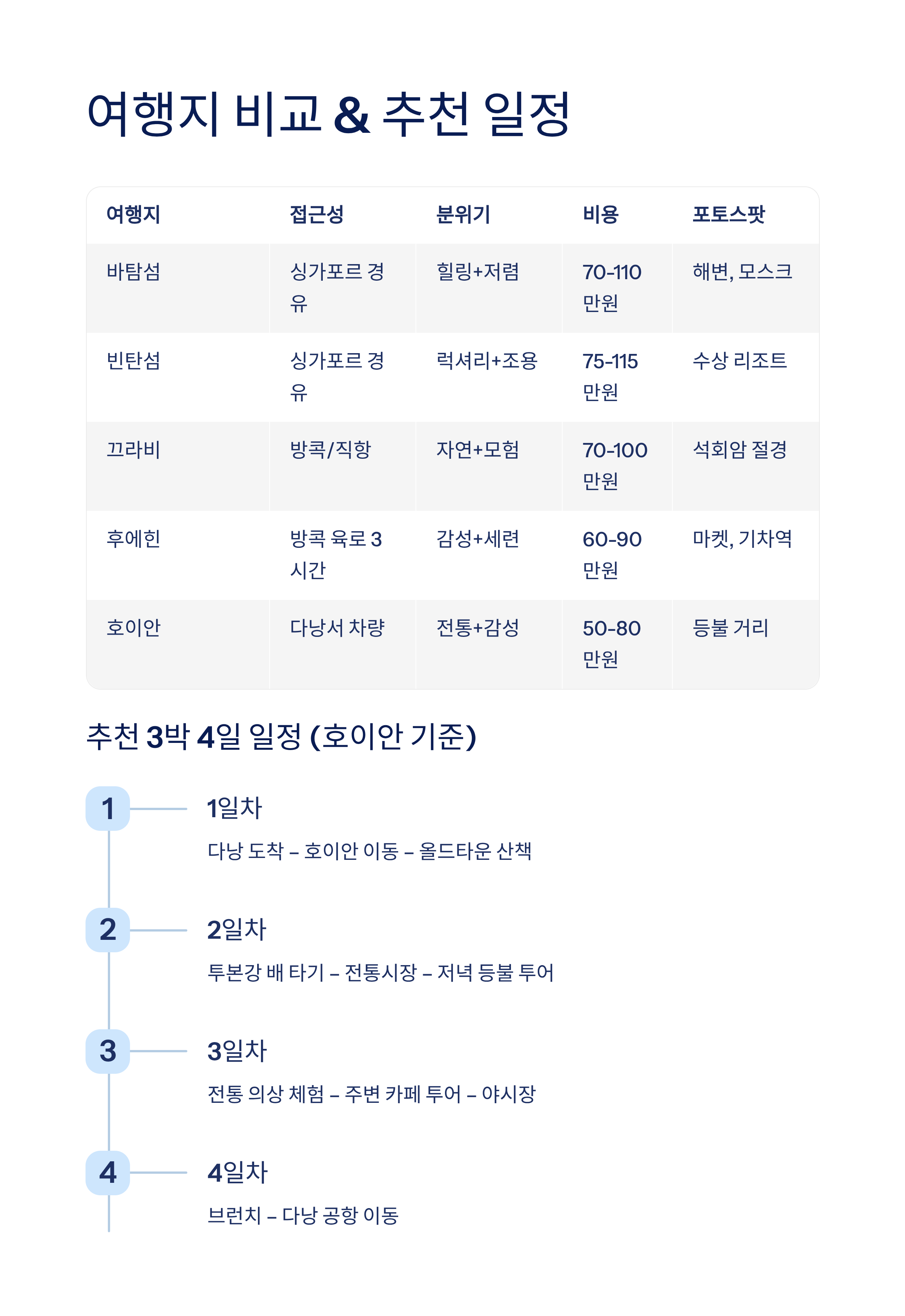 바탐섬 싱가포르 경유 해변, 모스크 힐링+저렴 약 70~110만원 빈탄섬 싱가포르 경유 수상 리조트, 스파 럭셔리+조용 약 75~115만원 끄라비 방콕/직항 가능 석회암 절경 자연+모험 약 70~100만원 후에힌 방콕 육로 3시간 마켓, 기차역 감성+세련 약 60~90만원 호이안 다낭에서 차량 등불 거리, 골목 전통+감성 약 50~80만원 추천 3박 4일 일정 예시 (호이안 기준)