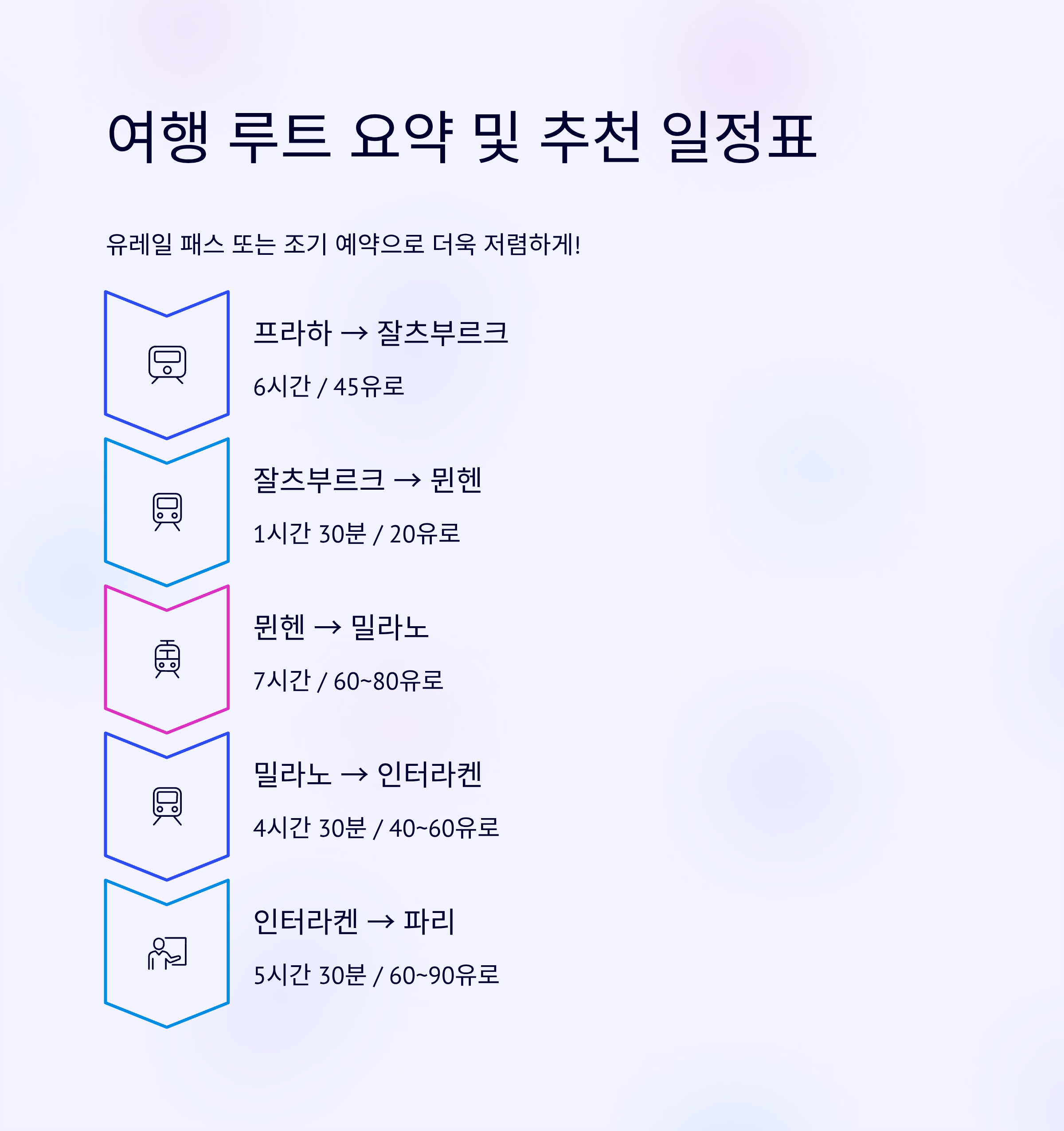 아래는 유럽 고속열차(Eurail 또는 개별국가 열차) 기준으로 각 도시 간 이동시간과 평균 예상 비용(2등석 기준)을 정리한 여행 루트입니다. 교통비는 유레일 패스를 활용하거나 구간권 조기 예약 시 더욱 저렴하게 이용할 수 있습니다.