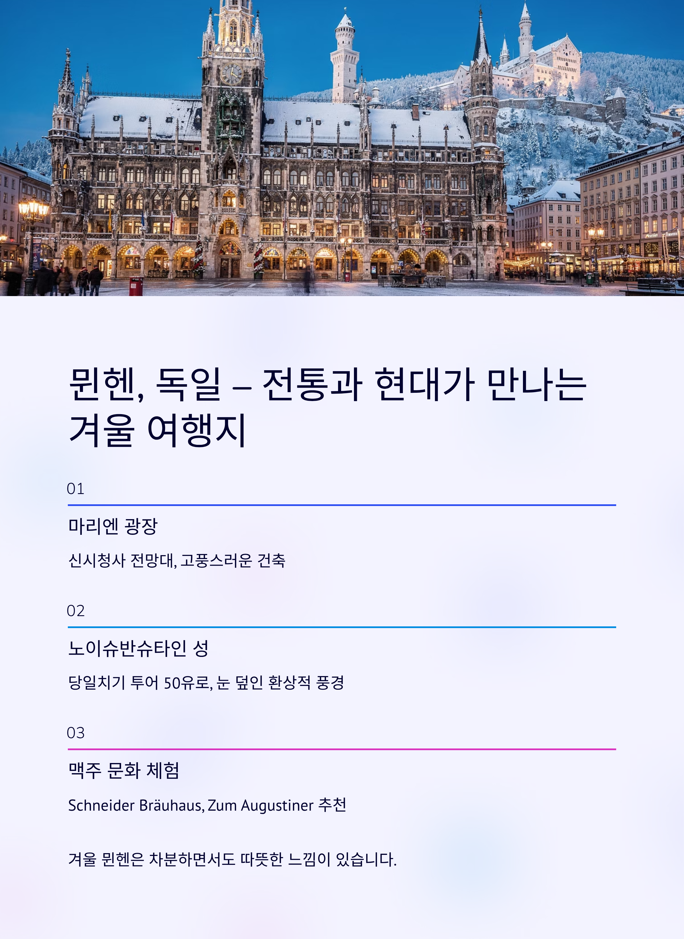 “겨울 뮌헨은 차분하면서도 따뜻한 느낌이 있어요. 성 투어는 꼭 가세요, 눈 덮인 풍경이 환상입니다.”뮌헨 근처 맛집 & 카페