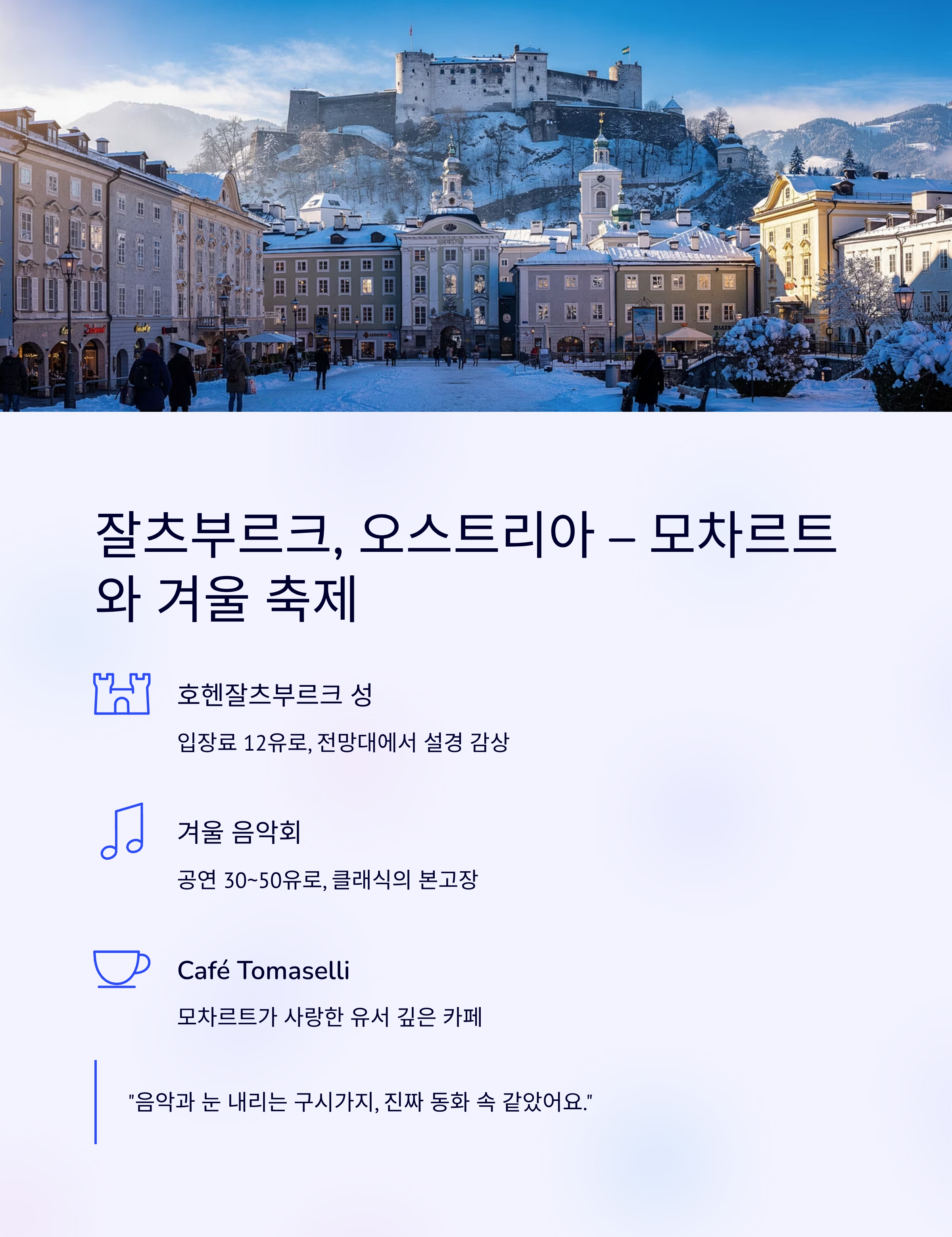 “음악과 눈 내리는 구시가지, 진짜 동화 속에 들어온 것 같았어요.”잘츠부르크 맛집 & 카페
