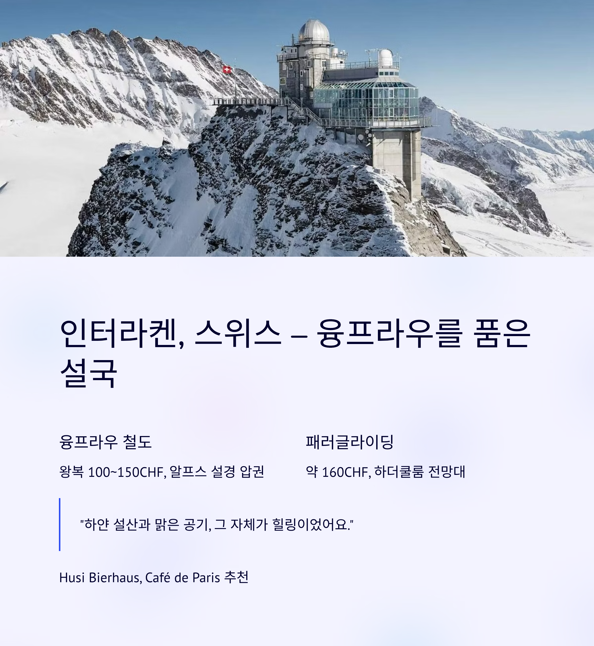 “하얀 설산과 알프스의 맑은 공기, 그 자체가 힐링이었어요. 겨울 스포츠 좋아하시는 분들에겐 천국입니다.”인터라켄 주변 맛집 & 카페