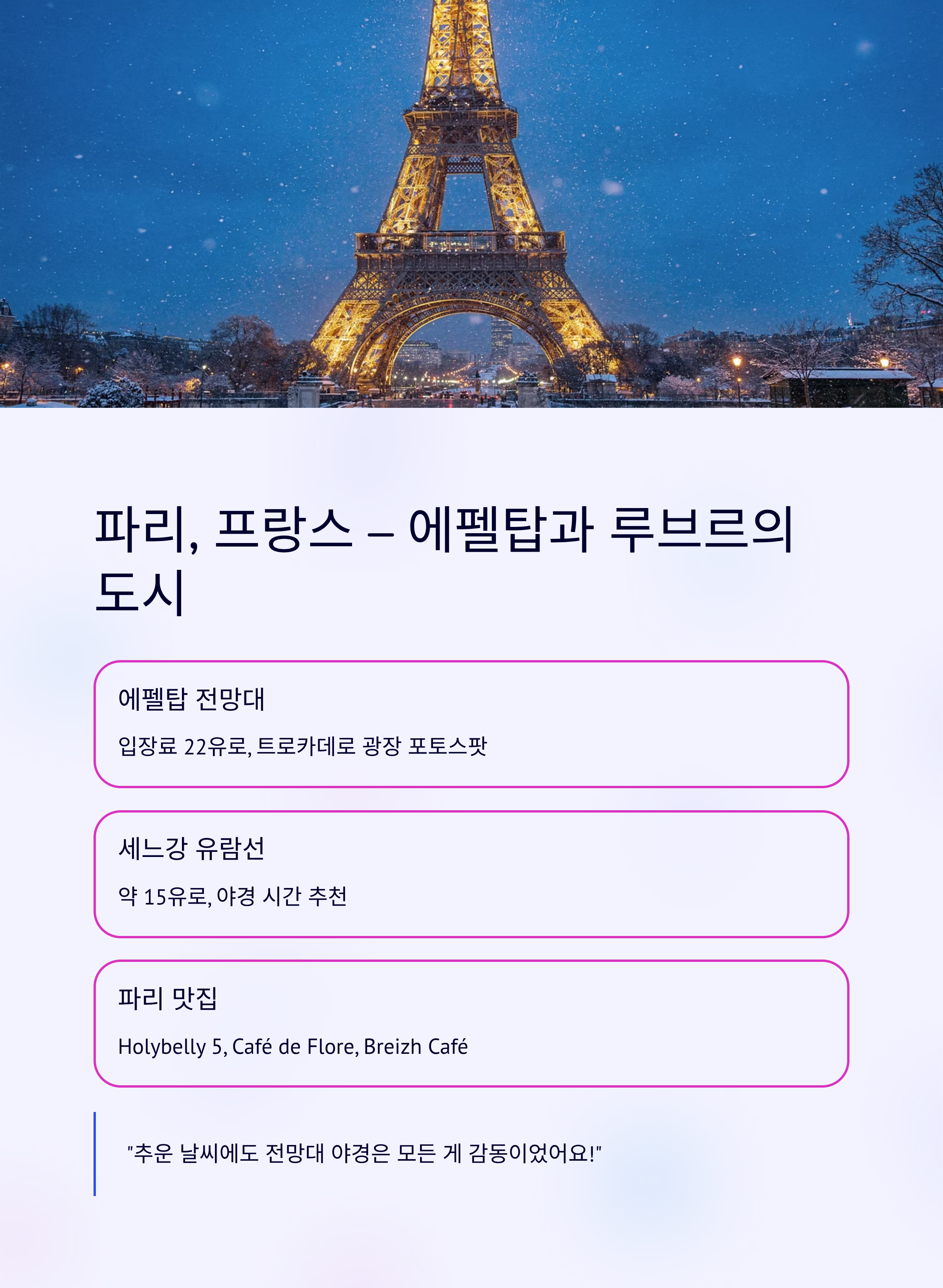 파리는 겨울에도 빛납니다. 특히 새하얀 눈이 살짝 덮인 에펠탑의 모습은 그야말로 영화의 한 장면 같습니다.