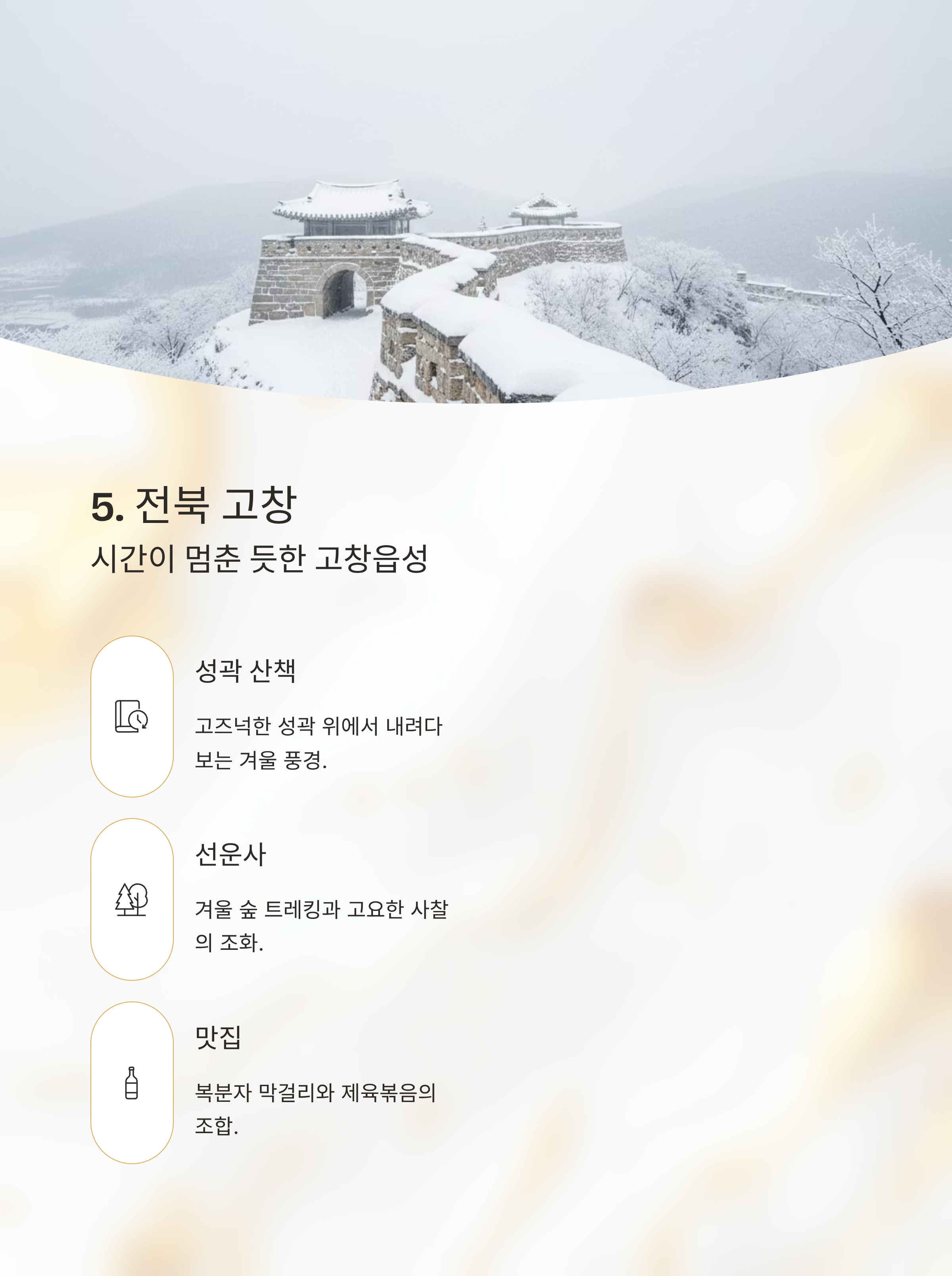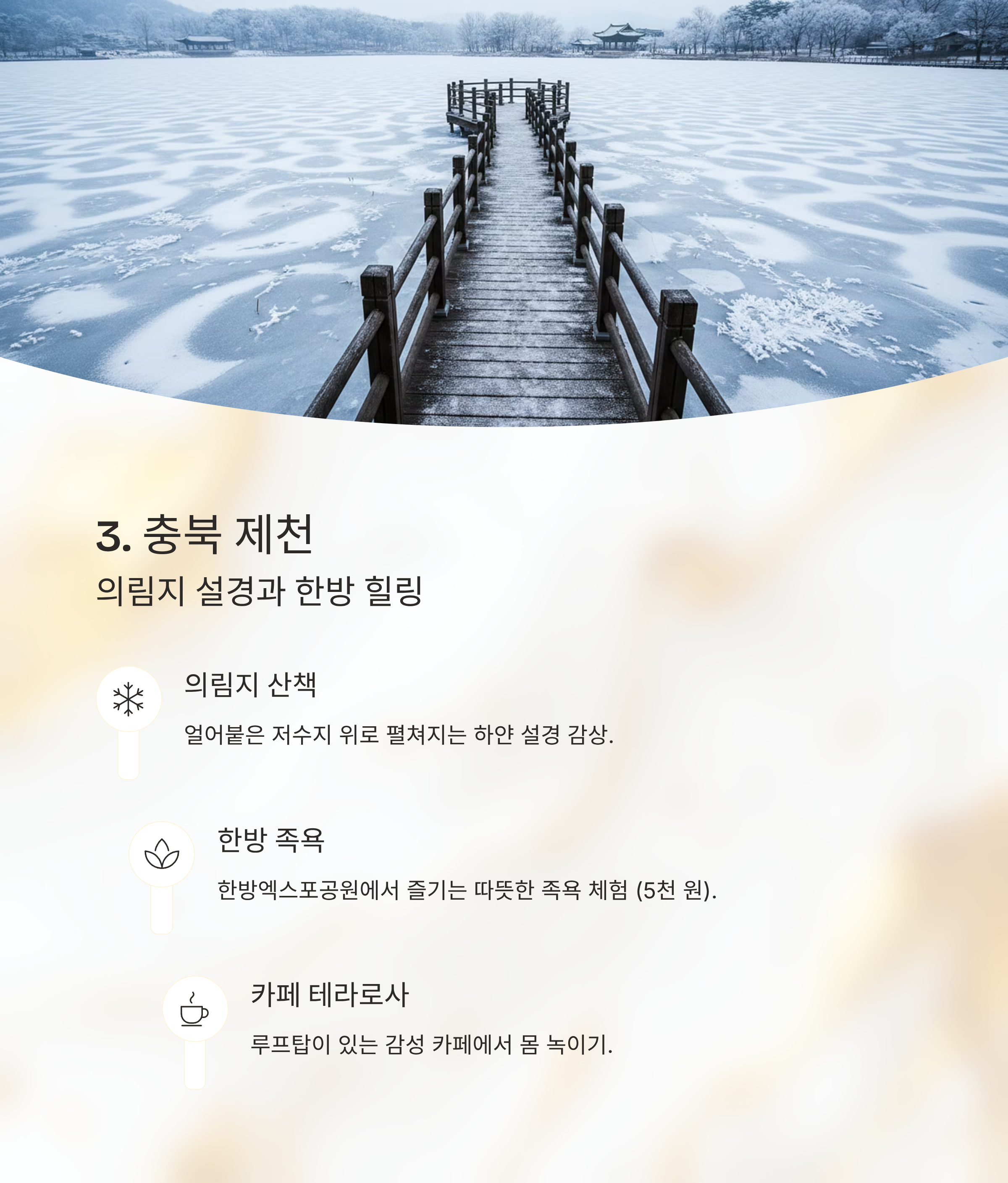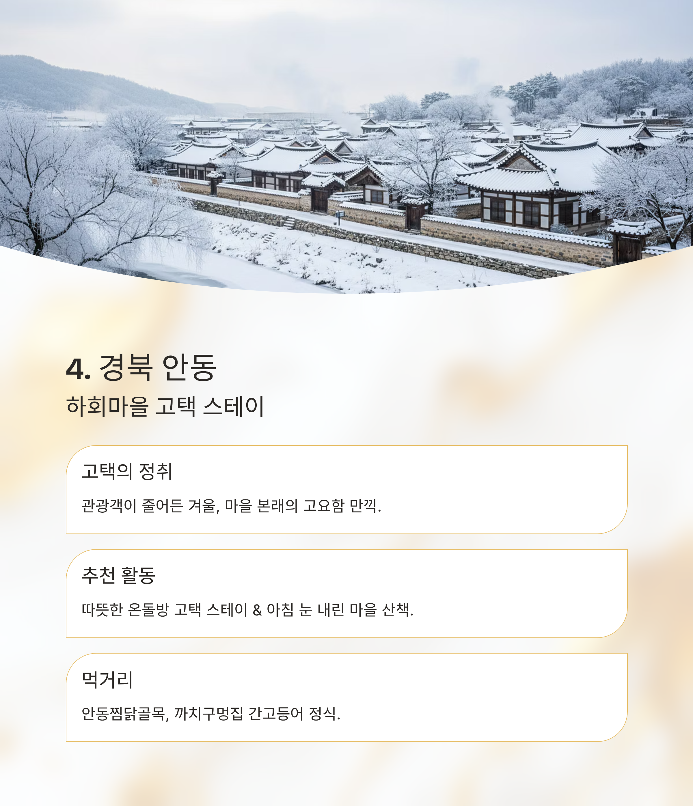 강원 평창 봉평 이효석 문학관 문학+설경 산책 약 3천 원 메밀밭 눈길 전남 구례 화엄사 사찰+눈 덮인 산길 약 4천 원 지리산 사찰 전경 충북 제천 의림지 호수 산책+족욕 무료 데크길+족욕존 경북 안동 하회마을 전통 고택 스테이 5천 원 고택 설경 전북 고창 고창읍성/선운사 고요한 역사 유적지 무료~3천 원 성곽 위 눈길
