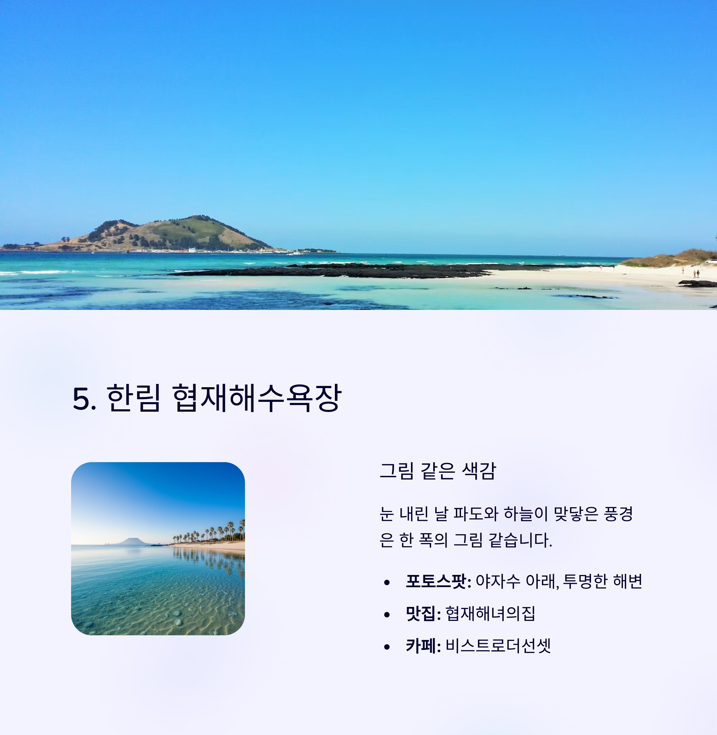 "1월에 협재를 찾았는데, 햇살과 파란 하늘이 정말 강렬했어요. 겨울 바다가 이렇게 아름다울 수 있다는 걸 처음 알았어요."주변 맛집 & 카페 추천