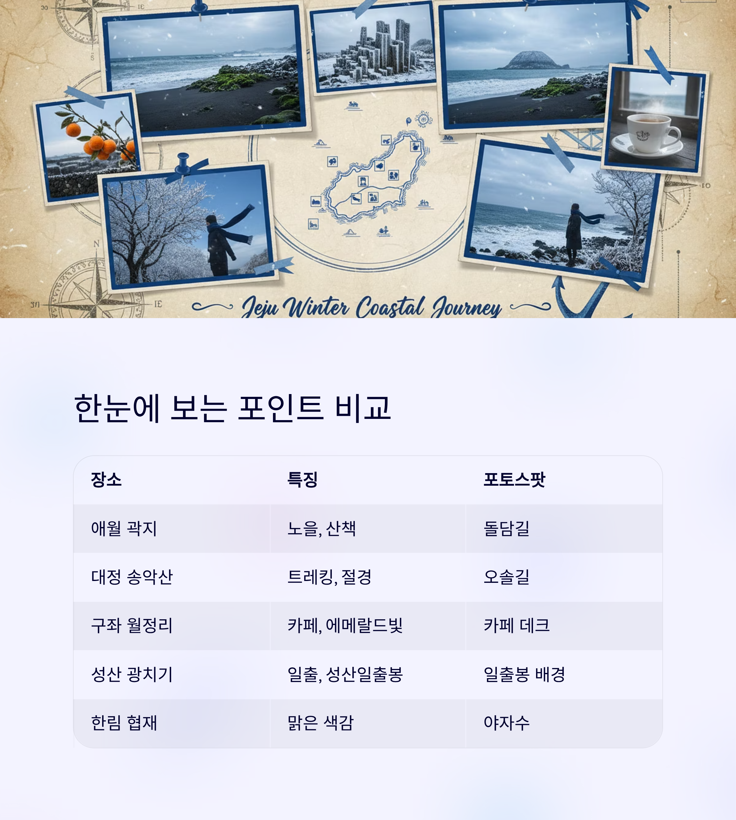 이번 글에서는 2025년 겨울 기준, SNS에서 가장 많이 언급되고 반응이 좋았던 제주 겨울 바다 포인트들을 모아 소개합니다.추천 장소는 모두 현지 후기와 최신 정보 기준으로 확인했고,
