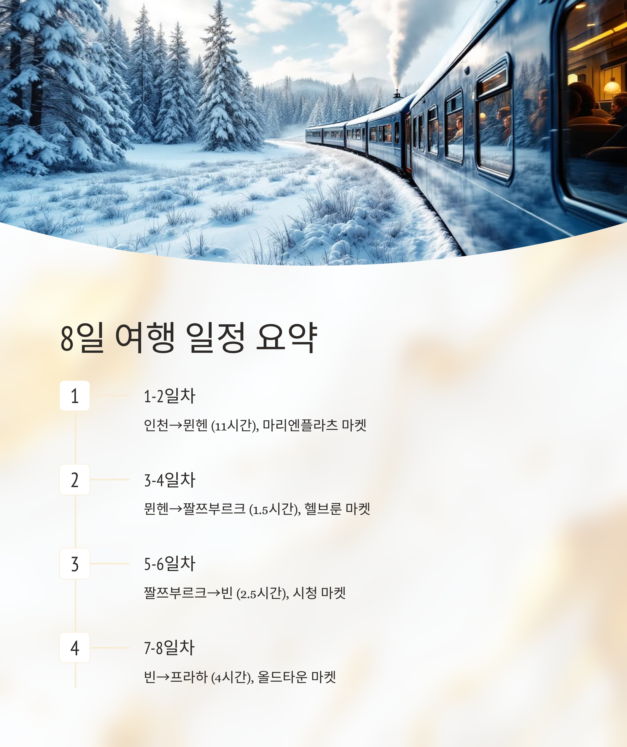 1일차 인천→뮌헨 (비행 약 11시간) / 공항→시내 S-Bahn 2일차 뮌헨 마리엔플라츠 마켓, 시내 관광, 맛집 투어 3일차 뮌헨→짤쯔부르크 기차 (1.5시간) / 헬브룬 마켓 관람 4일차 짤쯔부르크 구시가지 & 박물관, 맛집 산책 5일차 짤쯔부르크→빈 고속열차 (2.5시간) / 시청 마켓 투어 6일차 빈 시내 감성 산책 & 트리 만들기 체험 7일차 빈→프라하 열차 (4시간) / 올드타운 마켓 & 천문시계 관람 8일차 프라하 출발 → 인천 귀국