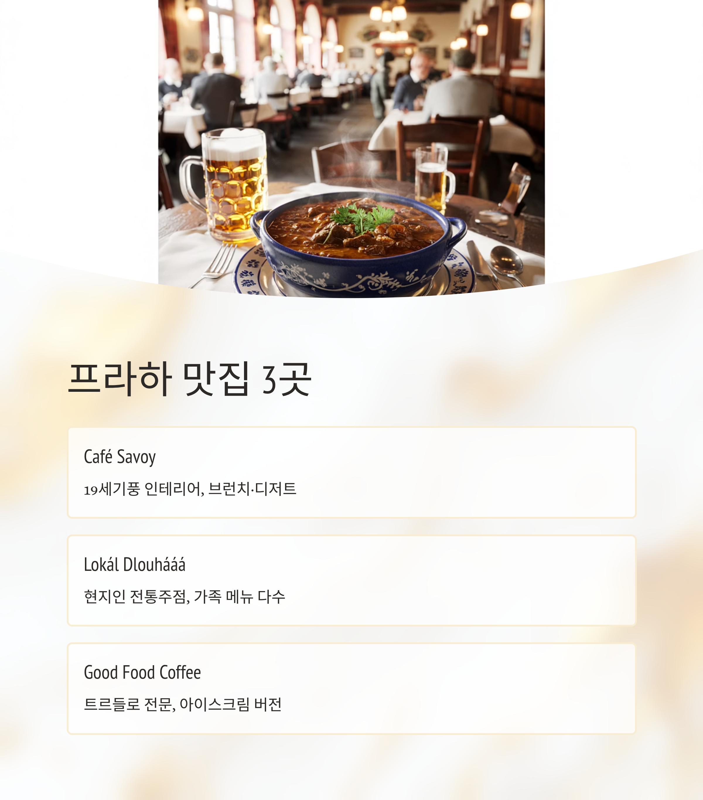 - 체코 전통 음식(트르들로, 굴라쉬 등)과 핸드메이드 소품 풍부