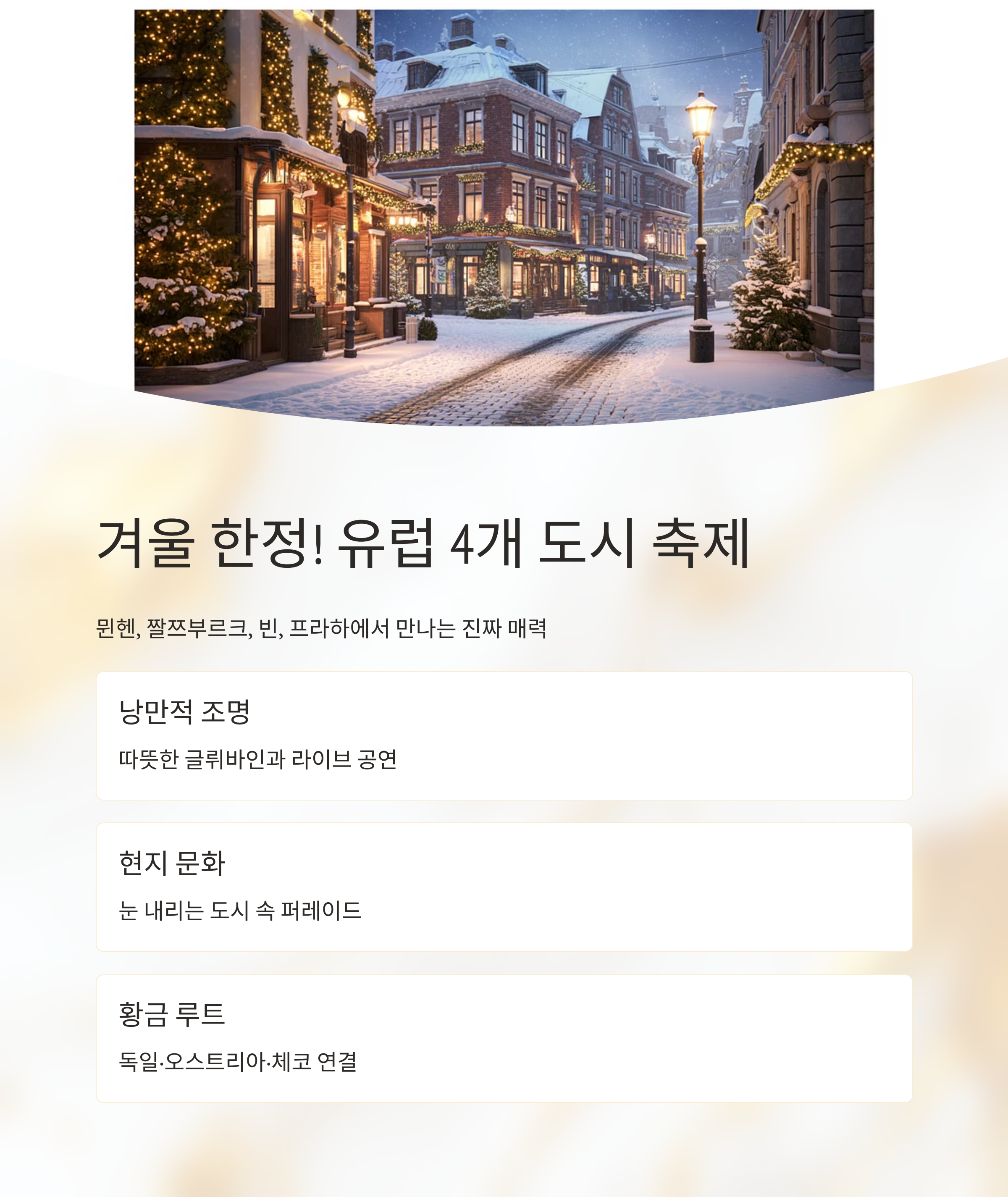 단순한 관광이 아닌, 기억에 남을 유럽의 한 장면을 선물해줄 거예요.이번 겨울,